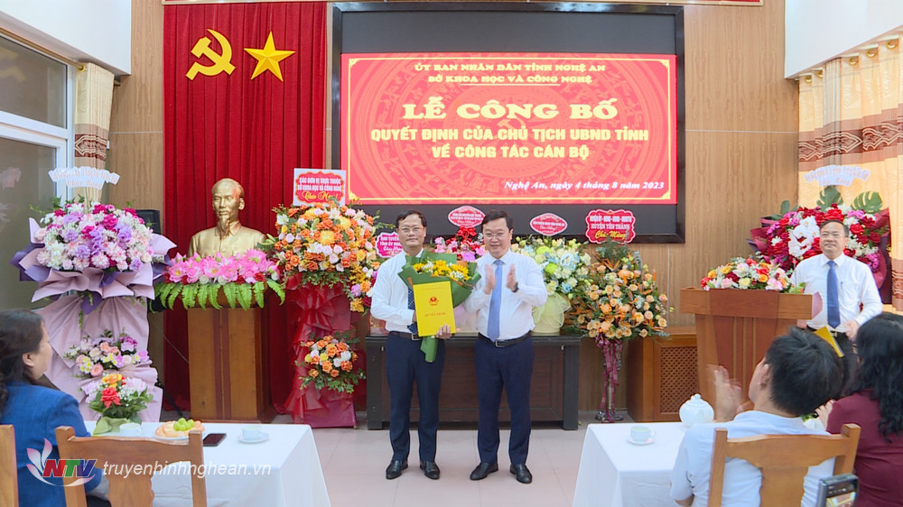 | Phó Bí thư Tỉnh uỷ Hoàng Nghĩa Hiếu trao quyết định và tặng hoa chúc mừng tân Bí thư Huyện uỷ Con Cuông. |
