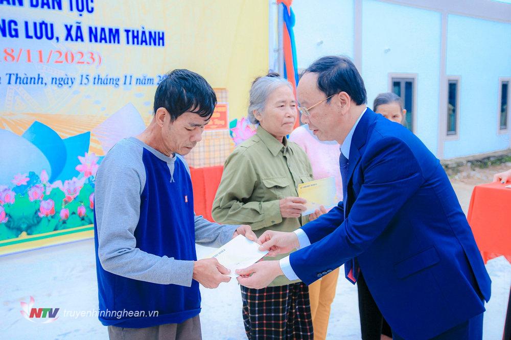 | Phó trưởng Đoàn ĐBQH tỉnh Thái Thị An Chung cùng lãnh đạo thị xã tặng quà cho các hộ có hoàn cảnh khó khăn trên địa bàn. |