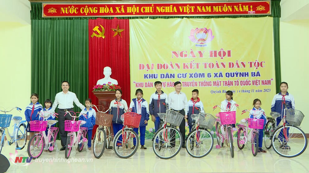 | Trưởng ban Nội chính Tỉnh uỷ Hồ Lê Ngọc và Bí thư Huyện uỷ Đô Lương Bùi Duy Đông trao quà cho xóm 6, xã Lam Sơn nhân ngày hội Đại đoàn kết toàn dân tộc. |