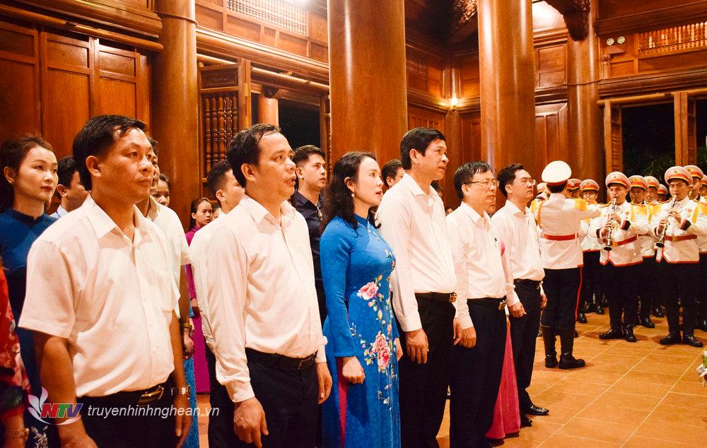 Tiếp đó, đoàn đại biểu cũng đã đến Đền Chung Sơn - Đền thờ Gia tiên Chủ tịch Hồ Chí Minh dâng hoa, dâng hương tưởng nhớ công lao trời biển của Chủ tịch Hồ Chí Minh, tri ân đấng sinh thành, anh chị em ruột, những người thân trong gia tộc và các anh hùng, liệt sĩ đã hi sinh vì độc lập, tự do của Tổ quốc, vì hạnh phúc của Nhân dân.