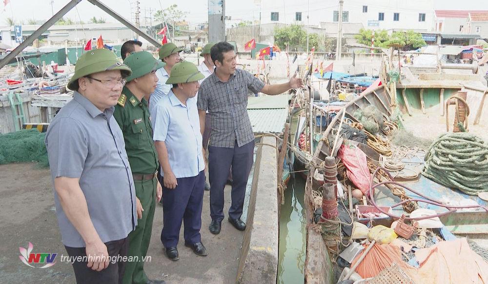 | Chủ tịch UBND tỉnh Nguyễn Đức Trung kiểm tra công tác ứng phó bão số 3 tại khu vực cảng cá lạch Quèn. |