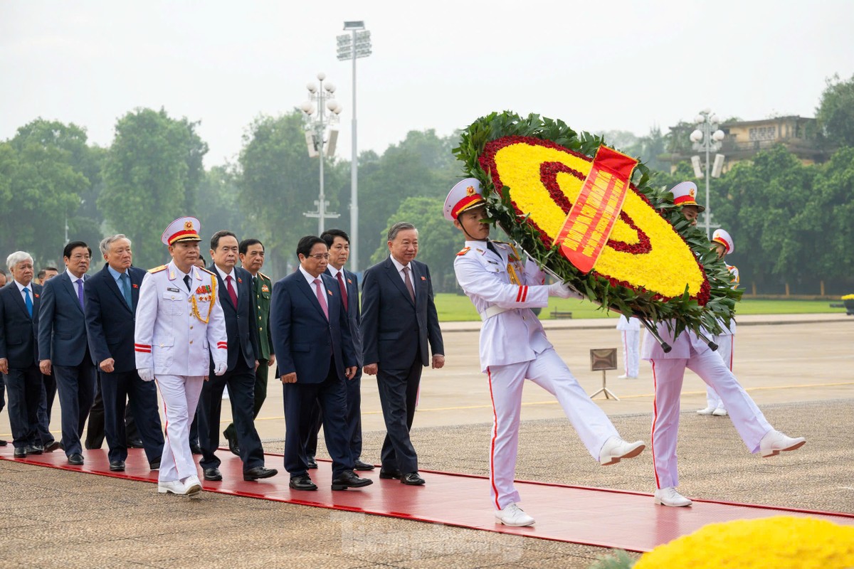 | Thủ tướng Chính phủ Phạm Minh Chính, Chủ tịch Quốc hội Trần Thanh Mẫn, Chủ tịch Ủy ban Trung ương MTTQ Việt Nam Đỗ Văn Chiến cùng các Phó Chủ tịch Quốc hội tặng hoa chúc mừng Tổng Bí thư Tô Lâm và Chủ tịch nước Lương Cường. Ảnh: TTXVN |