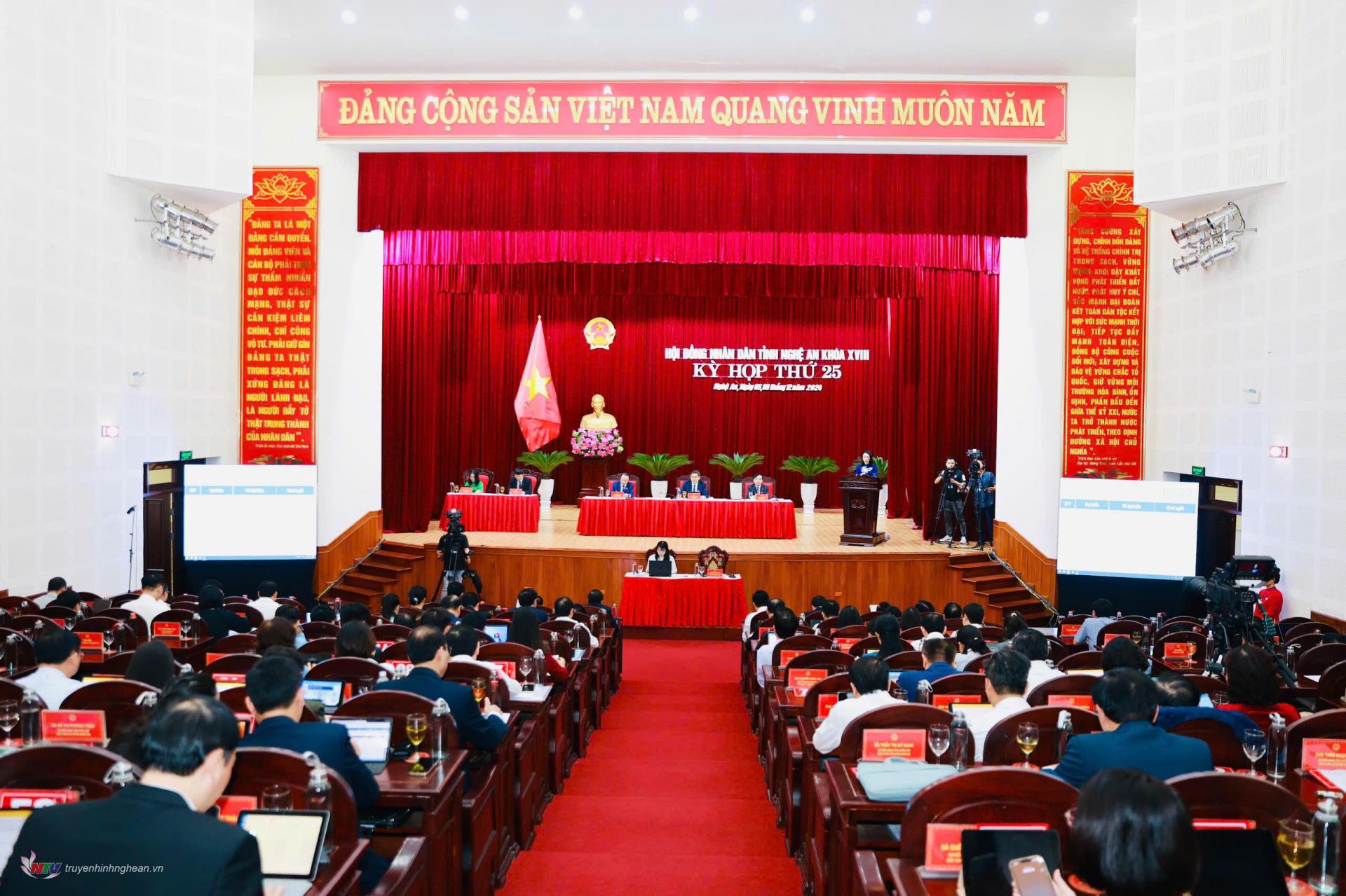 Đồng thời, đã thảo luận, biểu quyết thông qua 47 Nghị quyết liên quan trực tiếp đến đời sống dân sinh và sự phát triển của tỉnh như: Nghị quyết phê chuẩn quyết toán thu ngân sách trên địa bàn, quyết toán chi ngân sách địa phương năm 2023; Nghị quyết phê chuẩn dự toán thu ngân sách nhà nước trên địa bàn, chi ngân sách địa phương và phương án phân bổ ngân sách địa phương năm 2025; Nghị quyết quy định giá dịch vụ khám bệnh, chữa bệnh đối với các cơ sở khám bệnh, chữa bệnh của Nhà nước thuộc tỉnh Nghệ An quản lý; Nghị quyết về chính sách đất đai đối với đồng bào dân tộc thiểu số sinh sống trên địa bàn tỉnh Nghệ An; Nghị quyết thông qua Đề án công nhận thị xã Thái Hòa đạt tiêu chí đô thị loại III; Nghị quyết kết quả rà soát nghị quyết QPPL do HĐND tỉnh ban hành năm 2024; Nghị quyết về kế hoạch phát triển kinh tế - xã hội năm 2025; Nghị quyết về kế hoạch đầu tư công năm 2025; Nghị quyết giao biên chế công chức trong các cơ quan, tổ chức hành chính tỉnh Nghệ An năm 2024; Nghị quyết về tổng số người làm việc hưởng lương từ ngân sách, lao động hợp đồng trong các đơn vị sự nghiệp công lập chưa tự đảm bảo chi thường xuyên, tổ chức hội năm 2025; Nghị quyết về sáp nhập, đặt tên, đổi tên xóm; Nghị quyết về chủ trương đầu tư, điều chỉnh chủ trương đầu tư các dự án..