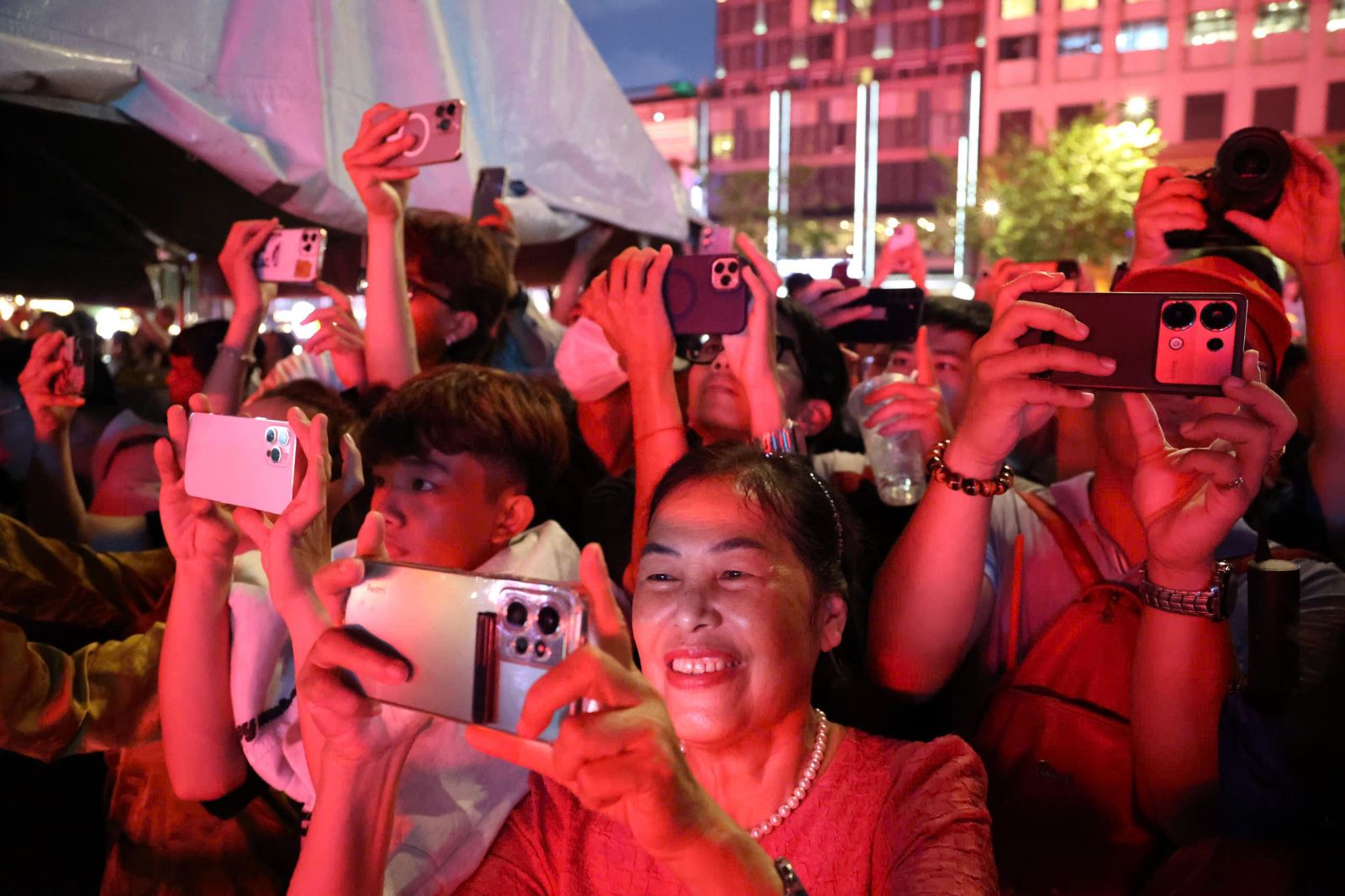 | Người xem thích thú dùng điện thoại ghi lại những hình ảnh ấn tượng từ màn trình diễn của 10.500 drone. |