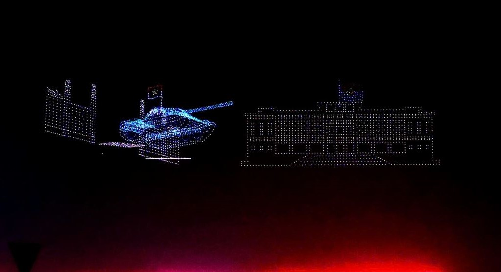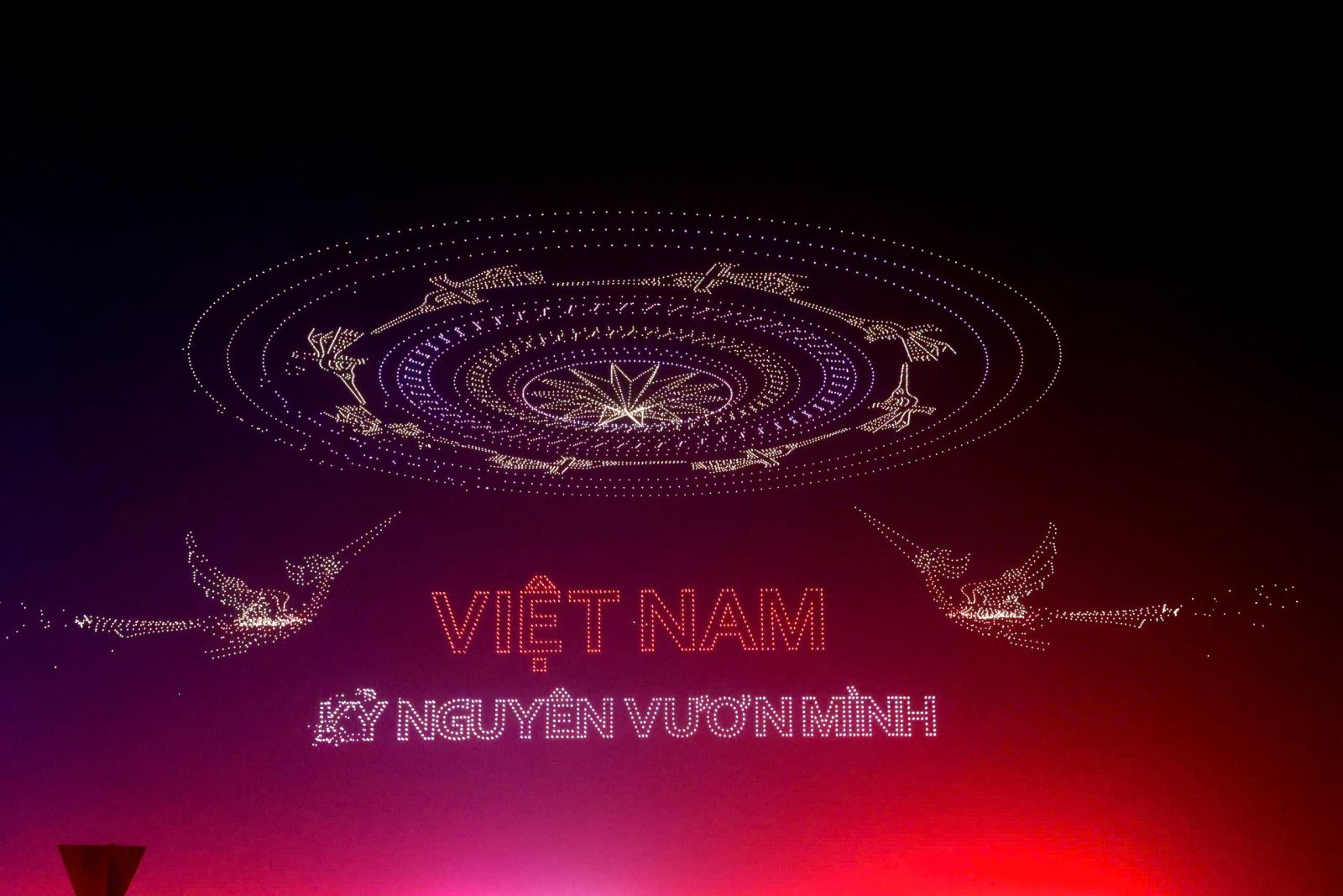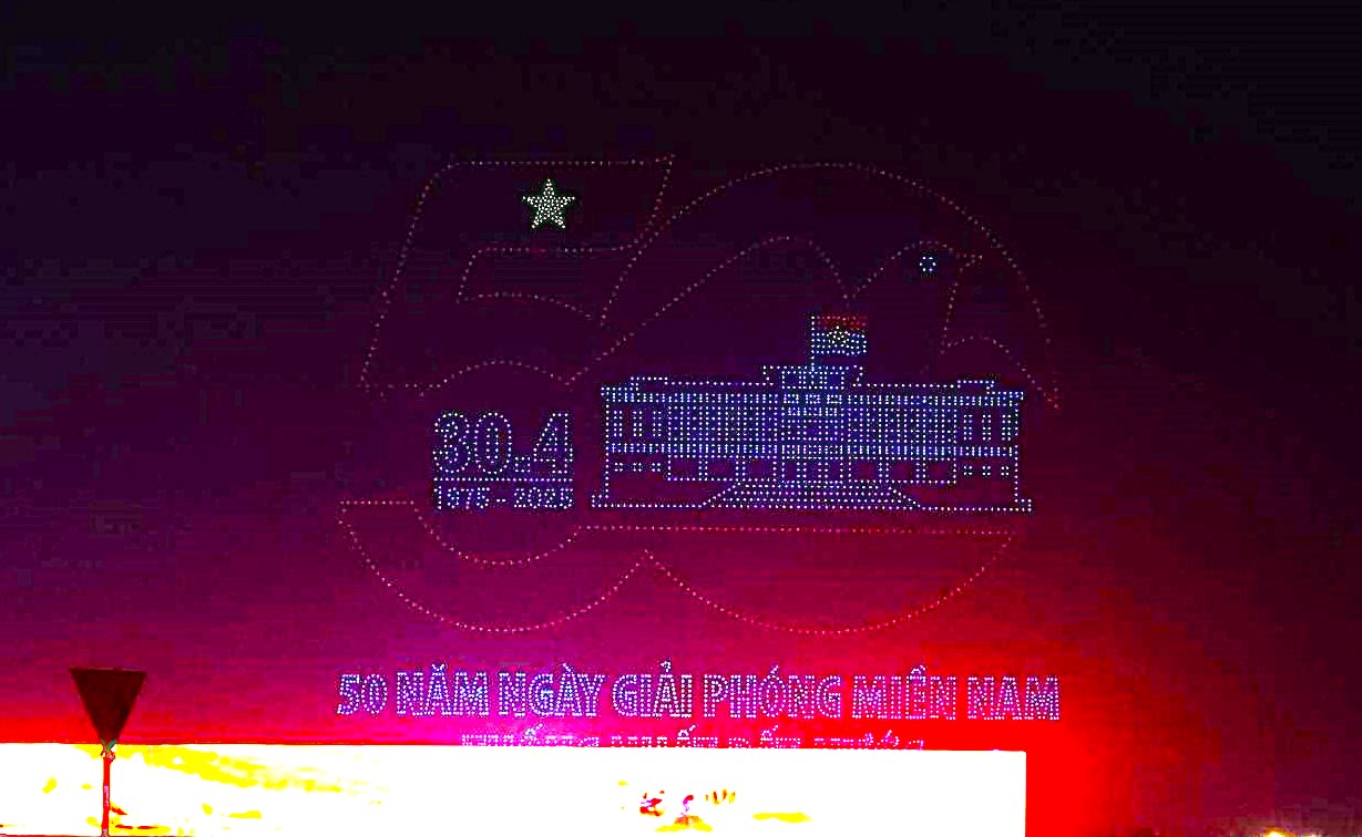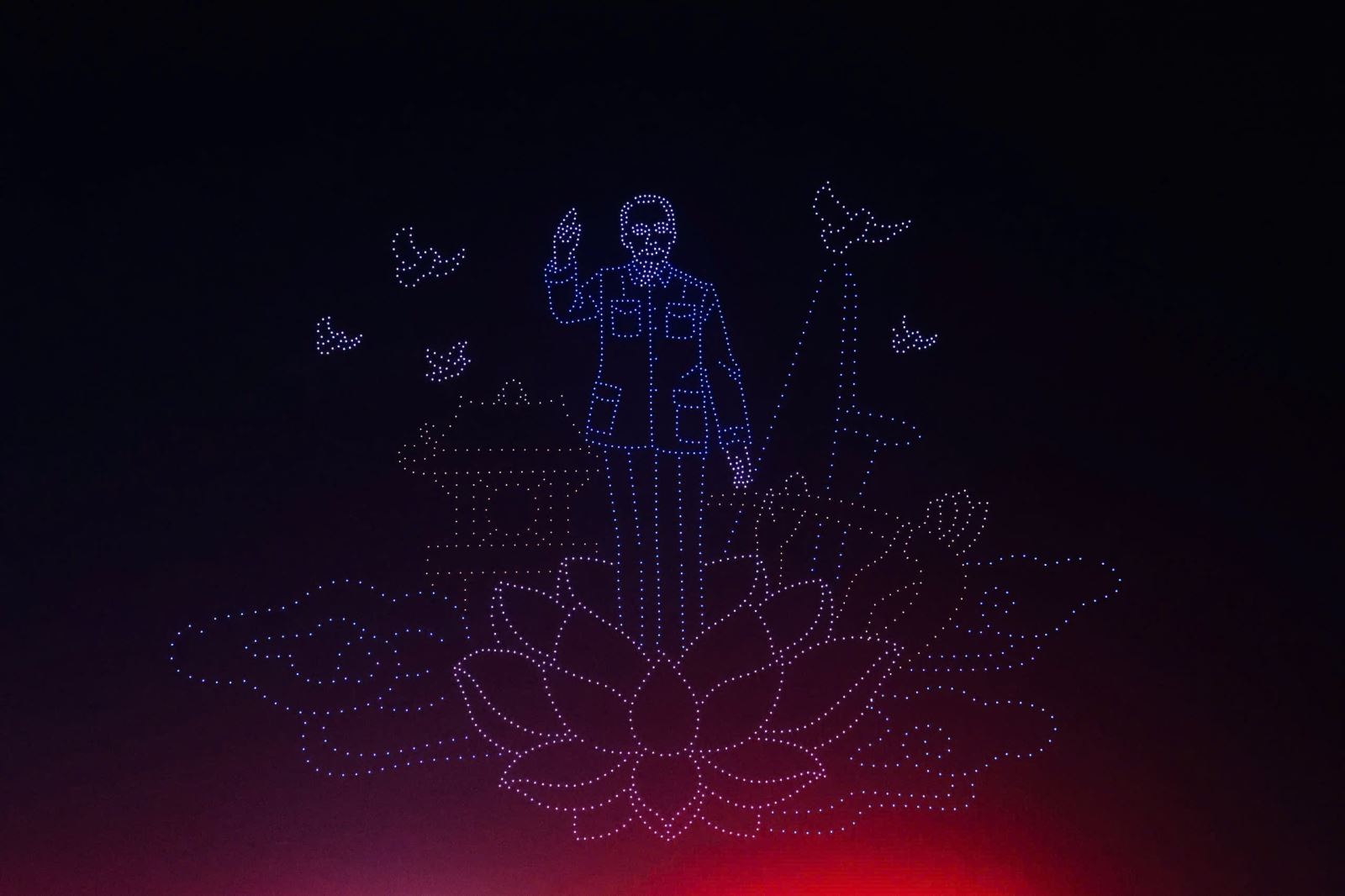 Theo đó, 10.500 drone đã "vẽ" hình trên nền trời đêm các khoảnh khắc lịch sử quan trọng của dân tộc, như hình ảnh xe tăng húc đổ cổng Dinh Độc Lập, lá cờ giải phóng tung bay trên nóc Dinh Độc Lập, hình ảnh Chủ tịch Hồ Chí Minh... khiến người xem thích thú và ấn tượng.