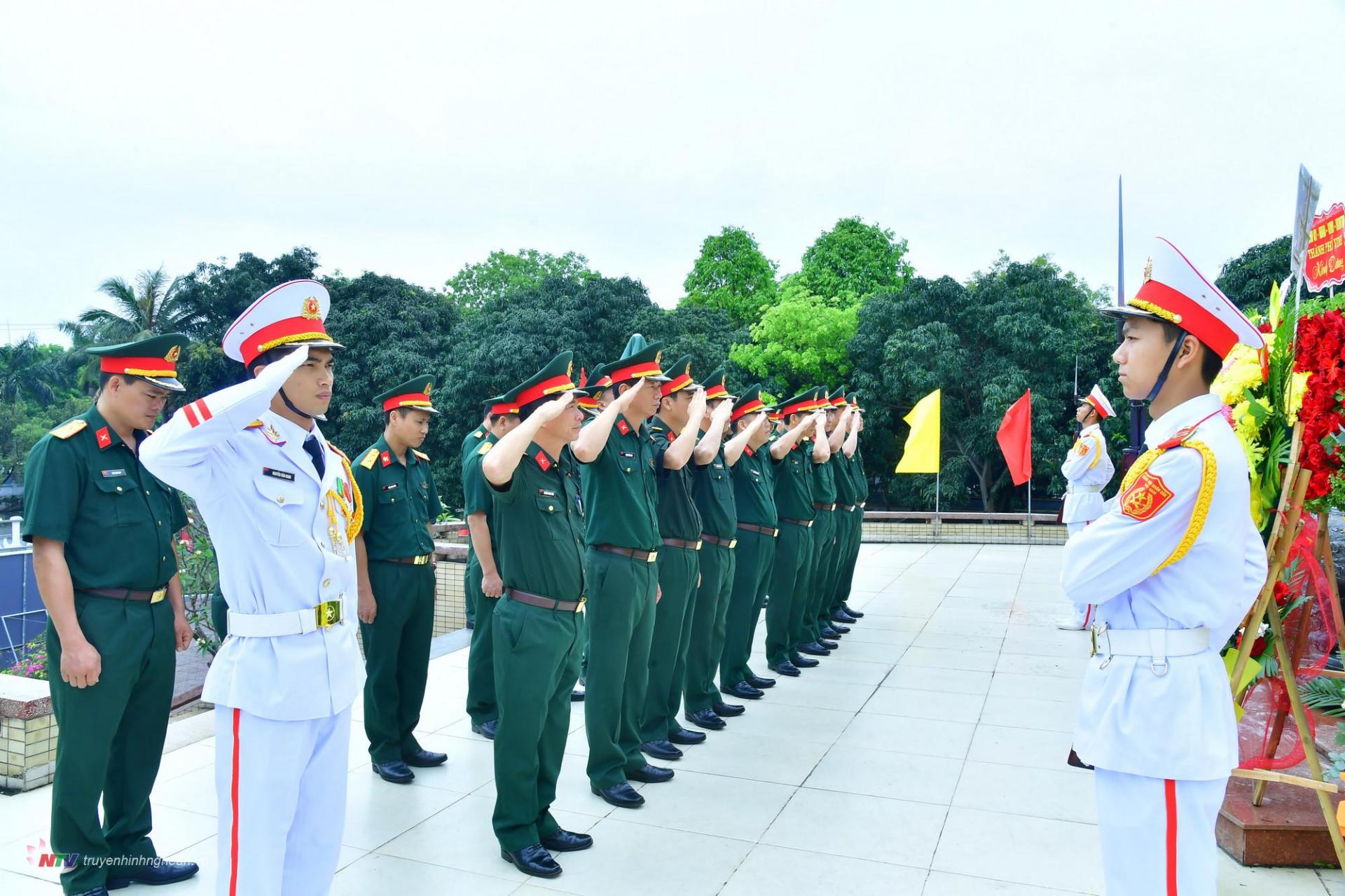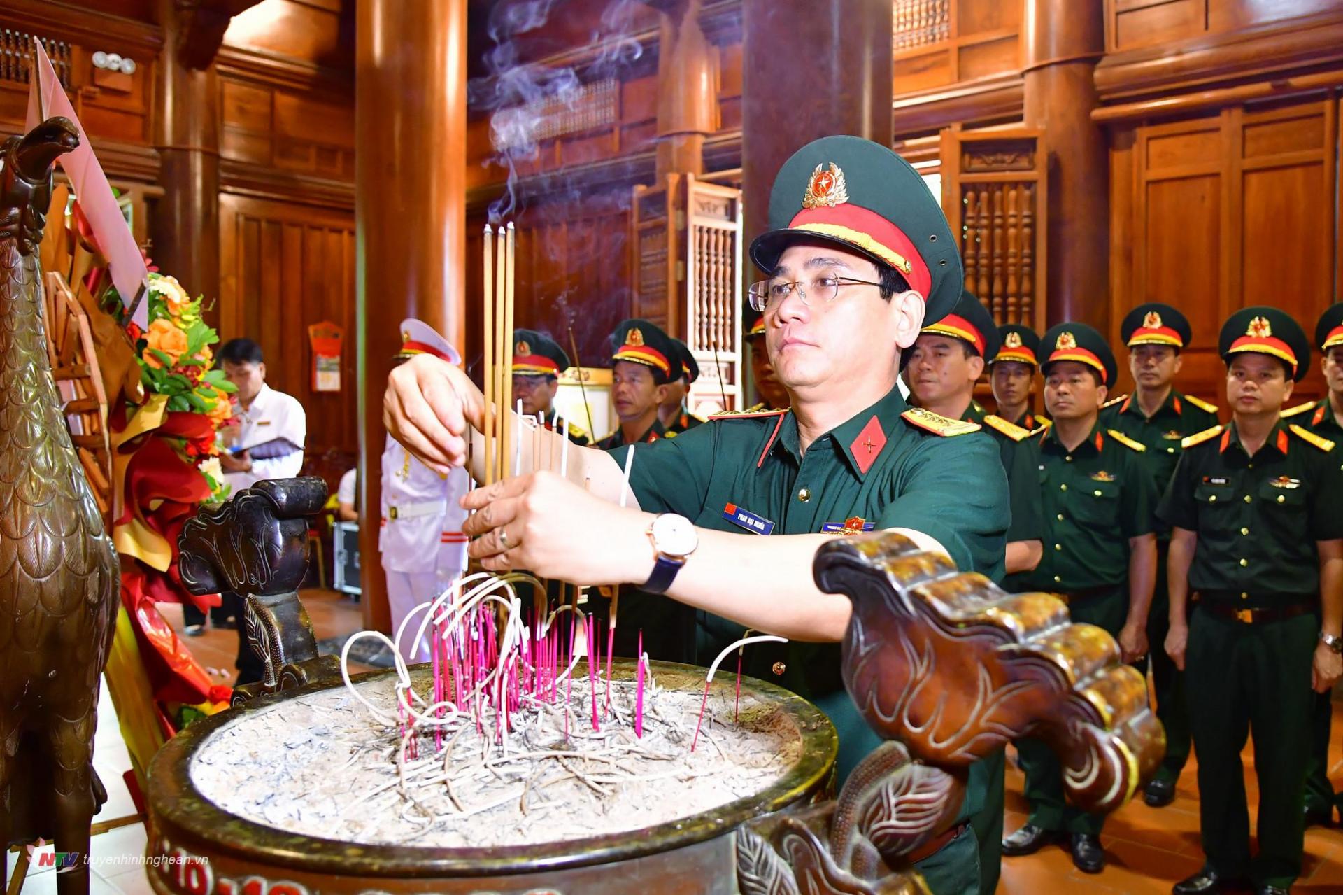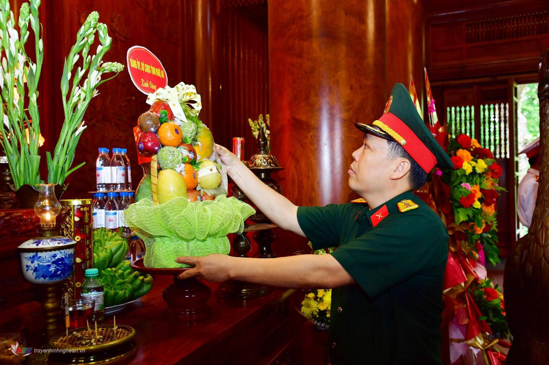 Tại Khu Di tích Quốc gia đặc biệt Kim Liên (Nam Đàn), Đoàn đại biểu Đảng uỷ - Bộ Chỉ huy Quân sự tỉnh Nghệ An thành kính dâng lẵng hoa tươi thắm, nén hương thơm, bày tỏ lòng biết ơn sâu sắc trước công lao to lớn của Chủ tịch Hồ Chí Minh - Người đã sáng lập, rèn luyện Quân đội nhân dân Việt Nam.