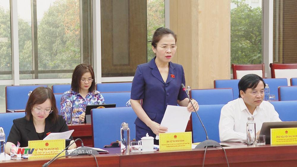 Trưởng đoàn ĐBQH tỉnh Võ Thị Minh Sinh cho rằng: Về sắp xếp đơn vị hành chính, kể cả việc đặt tên cần phát huy dân chủ của nhân dân. Đồng chí đề nghị Toà án nhân dân, Viện Kiểm sát nhân dân phối hợp trong tổ chức sắp xếp bộ máy, đảm bảo sự thống nhất trong đặt trụ sở, phân trại, tạo điều kiện thuận lợi nhất cho nhân dân; Đồng thời bày tỏ sự băn khoăn về hướng chỉ đạo, xử lý những vướng mắc của dự án Thủy lợi Bản Mồng trong thời gian tới khi chấm dứt hoạt động của chính quyền cấp huyện.