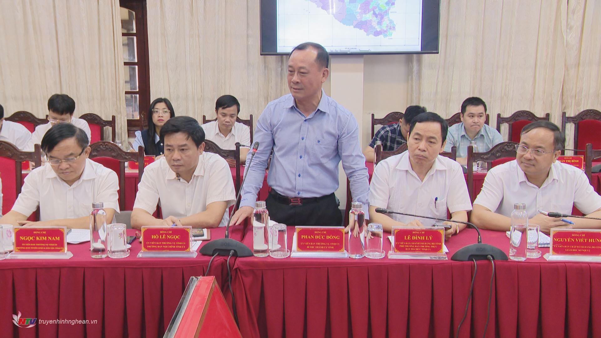 | Đồng chí Phan Đức Đồng - Ủy viên BTV Tỉnh ủy, Bí thư Thành ủy Vinh phát biểu tại cuộc họp. |