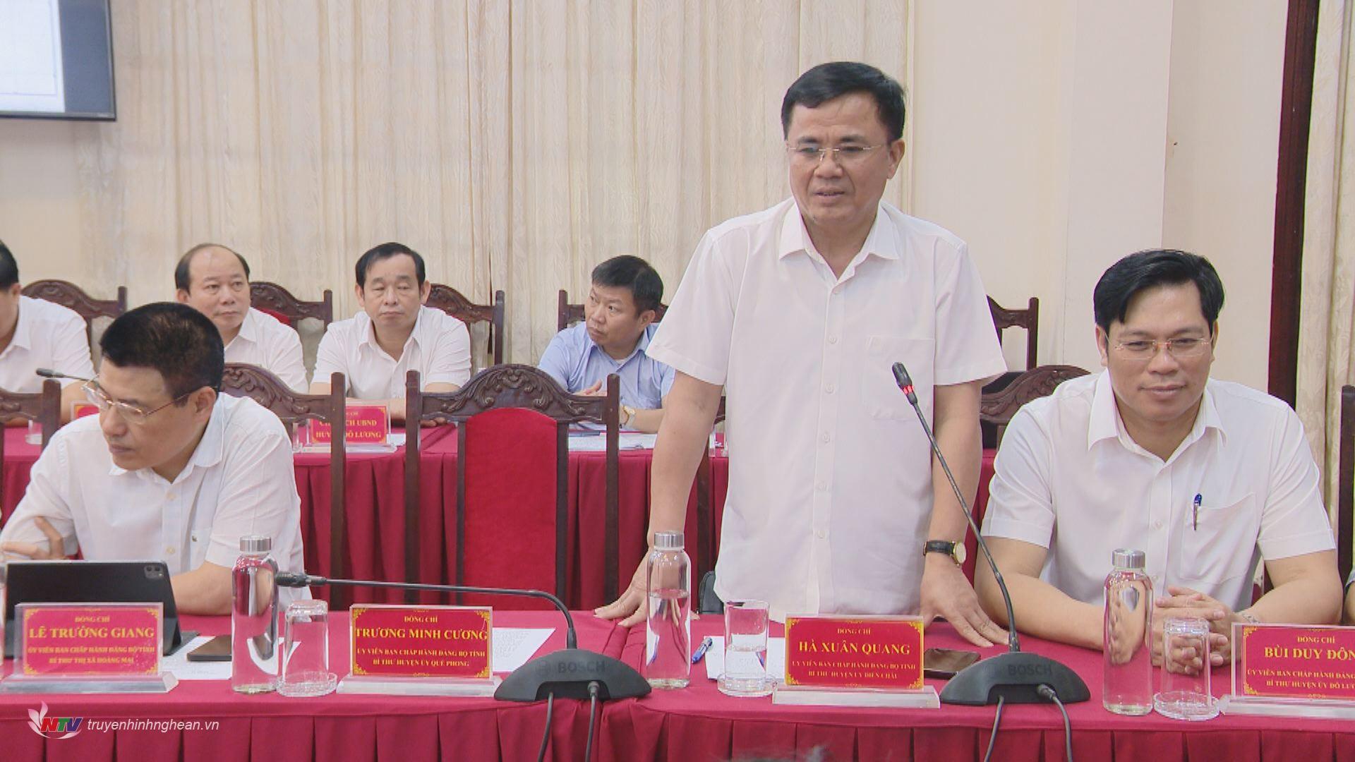 | Đồng chí Hà Xuân Quang - Bí thư Huyện ủy Diễn Châu phát biểu tại cuộc họp. |