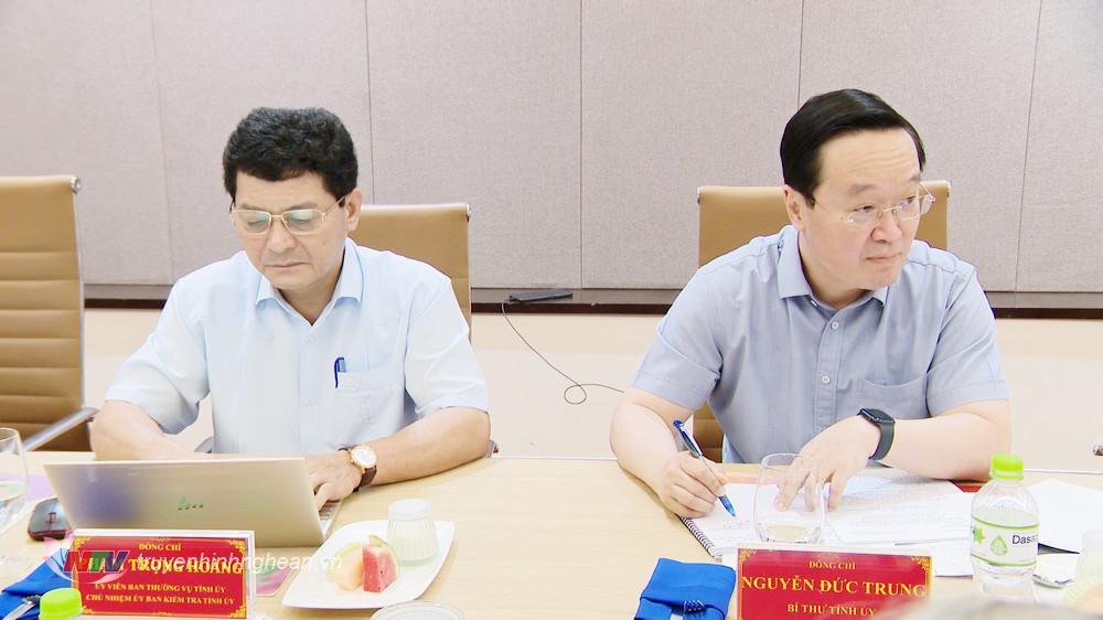 | Bí thư Tỉnh uỷ Nguyễn Đức Trung và Chủ nhiệm UBKT Tỉnh uỷ Phạm Trọng Hoàng lắng nghe ý kiến của các chuyên gia tại buổi làm việc. |