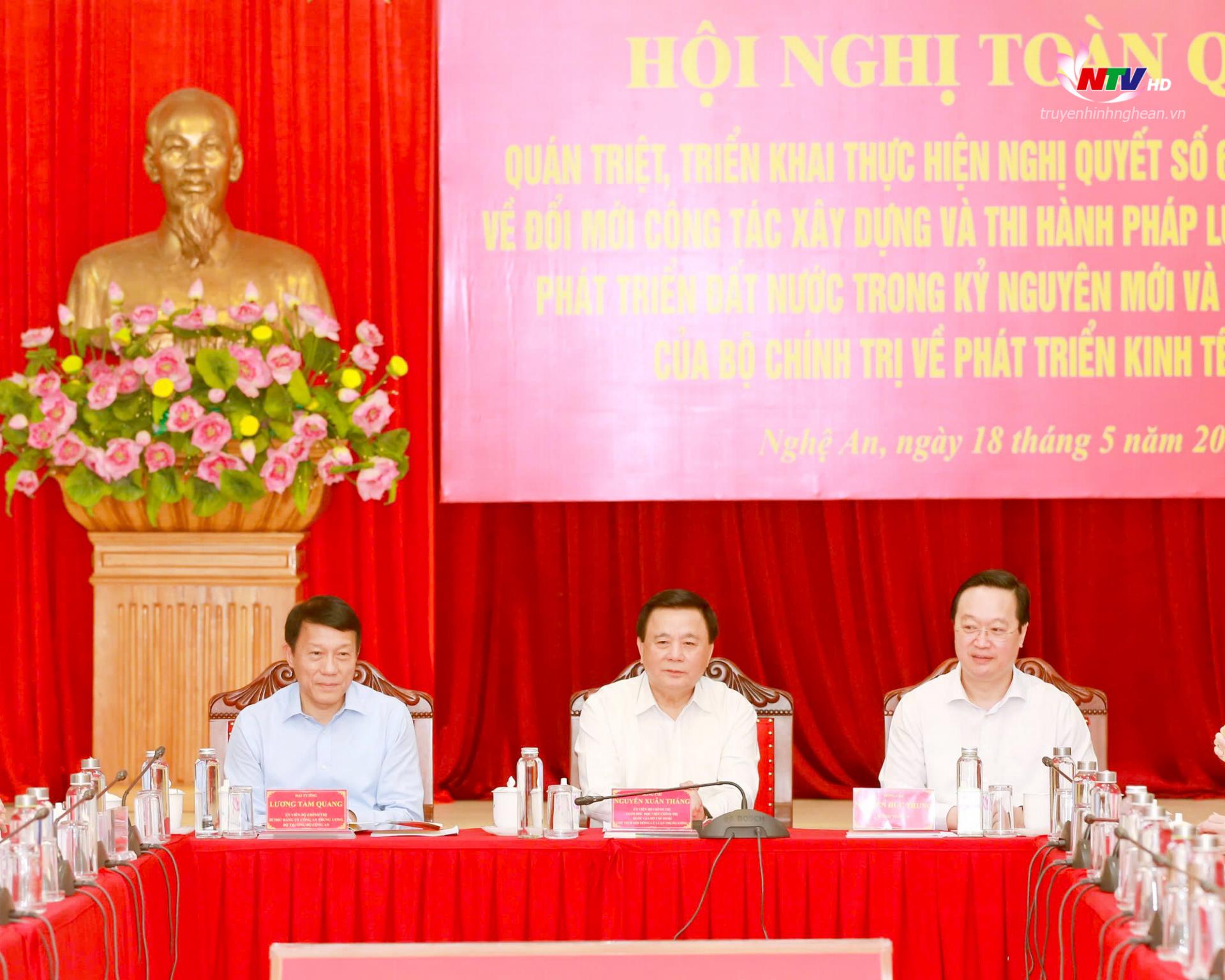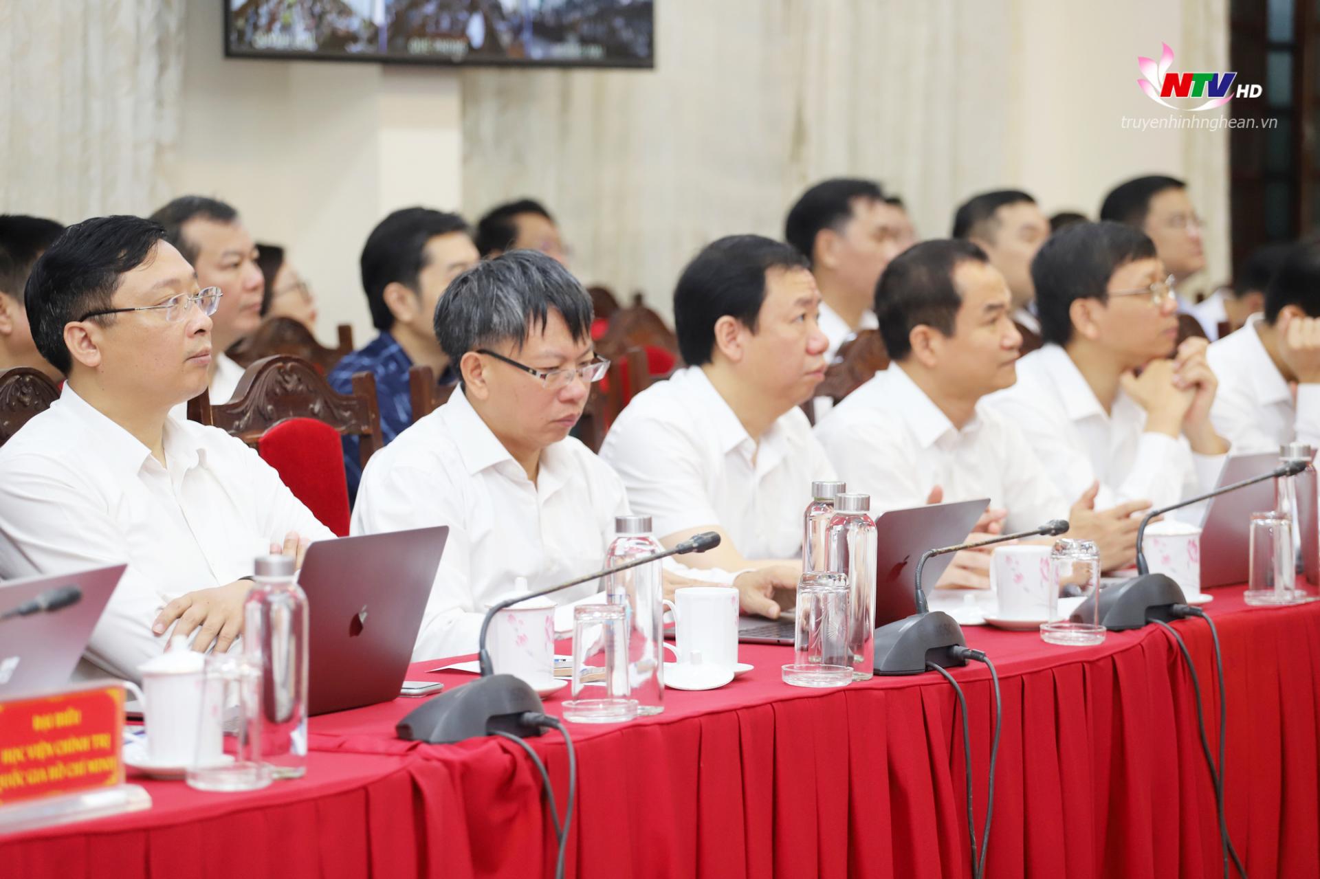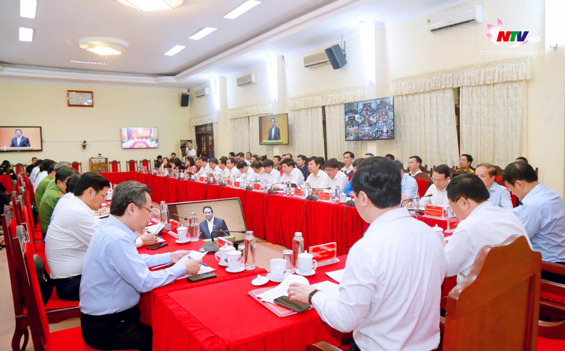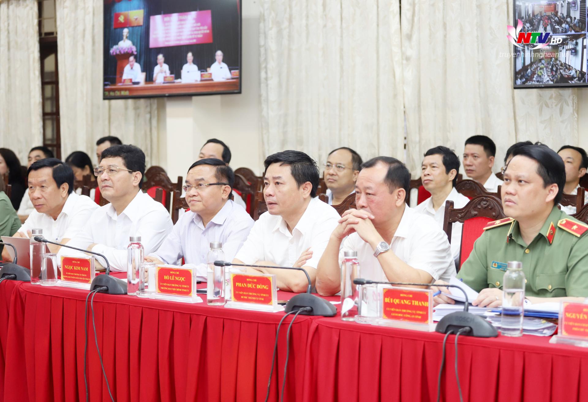 | Các đồng chí: Nguyễn Xuân Thắng - Ủy viên Bộ Chính trị, Giám đốc Học viện Chính trị quốc gia Hồ Chí Minh, Chủ tịch Hội đồng Lý luận Trung ương; Đại tướng Lương Tam Quang - Ủy viên Bộ Chính trị, Bộ trưởng Bộ Công an; Nguyễn Đức Trung - Bí thư Tỉnh ủy chủ trì điểm cầu tỉnh Nghệ An. |