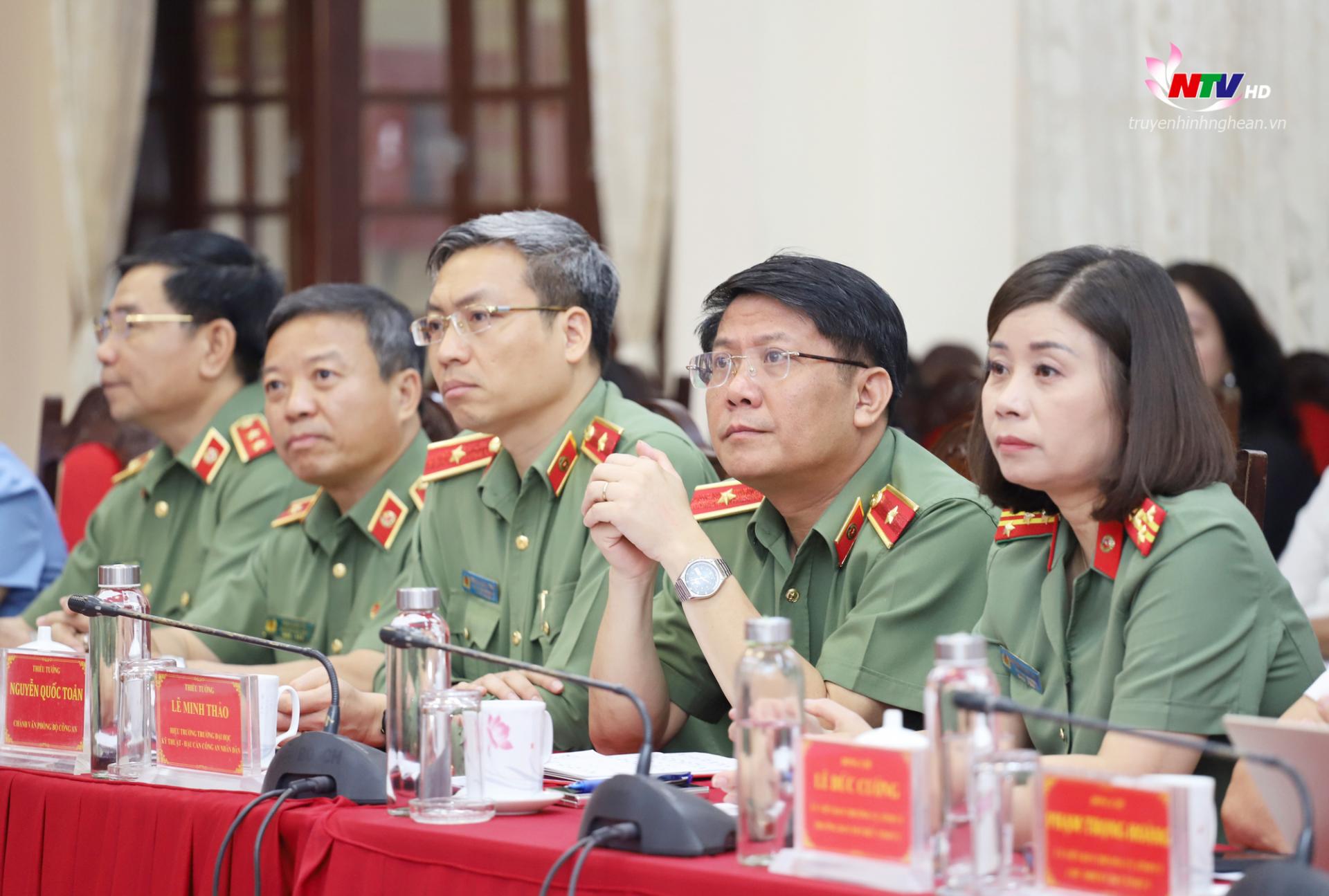 | Các đồng chí lãnh đạo các đơn vị trực thuộc Bộ Công an tham dự hội nghị tại điểm cầu tỉnh Nghệ An. |