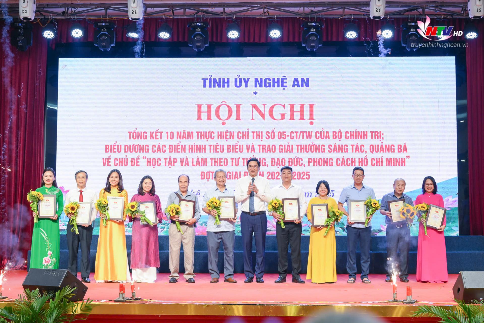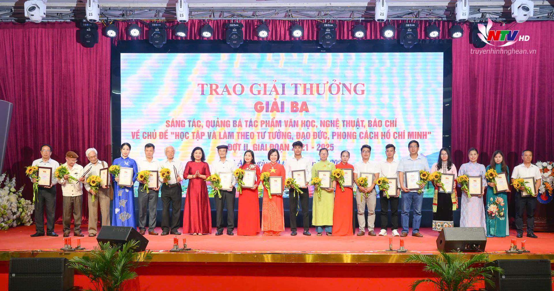 | Đồng chí Nguyễn Thị Hồng Hoa - Ủy viên Ban Chấp hành Đảng bộ tỉnh, Phó Trưởng ban Tuyên giáo và Dân vận Tỉnh ủy Nghệ An trao giải Ba cho các tác giả, nhóm tác giả đạt giải thưởng sáng tác, quảng bá tác phẩm văn học, nghệ thuật, báo chí về chủ đề “Học tập và làm theo tư tưởng, đạo đức, phong cách Hồ Chí Minh” cấp tỉnh, đợt II, giai đoạn 2021 - 2025. |