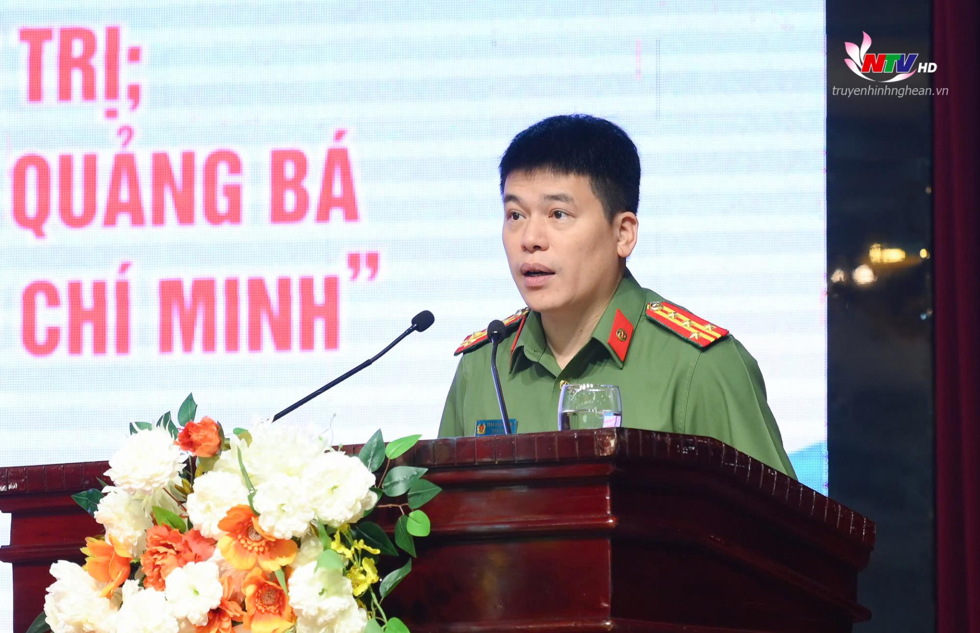| Đại tá Trần Hồng Quang - Phó Bí thư Đảng ủy, Phó Giám đốc Công an tỉnh trình bày tham luận: "Công an Nghệ An thi đua học tập, thực hiện Sáu điều Bác Hồ dạy. Những thành tích và bài học kinh nghiệm". |
