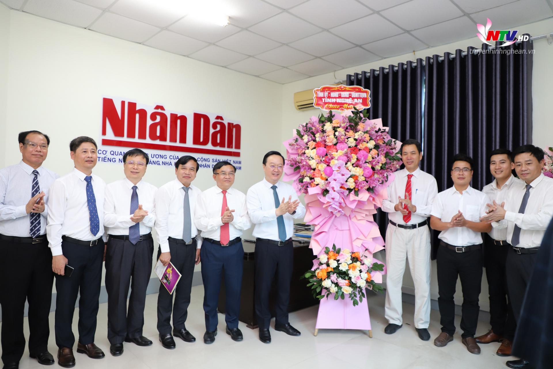 | Đồng chí Nguyễn Đức Trung - Bí thư Tỉnh ủy cùng đoàn tặng hoa, chúc mừng Văn phòng Đại diện thường trú Báo Nhân Dân tại Nghệ An nhân kỷ niệm 100 năm ngày Báo chí cách mạng Việt Nam. |