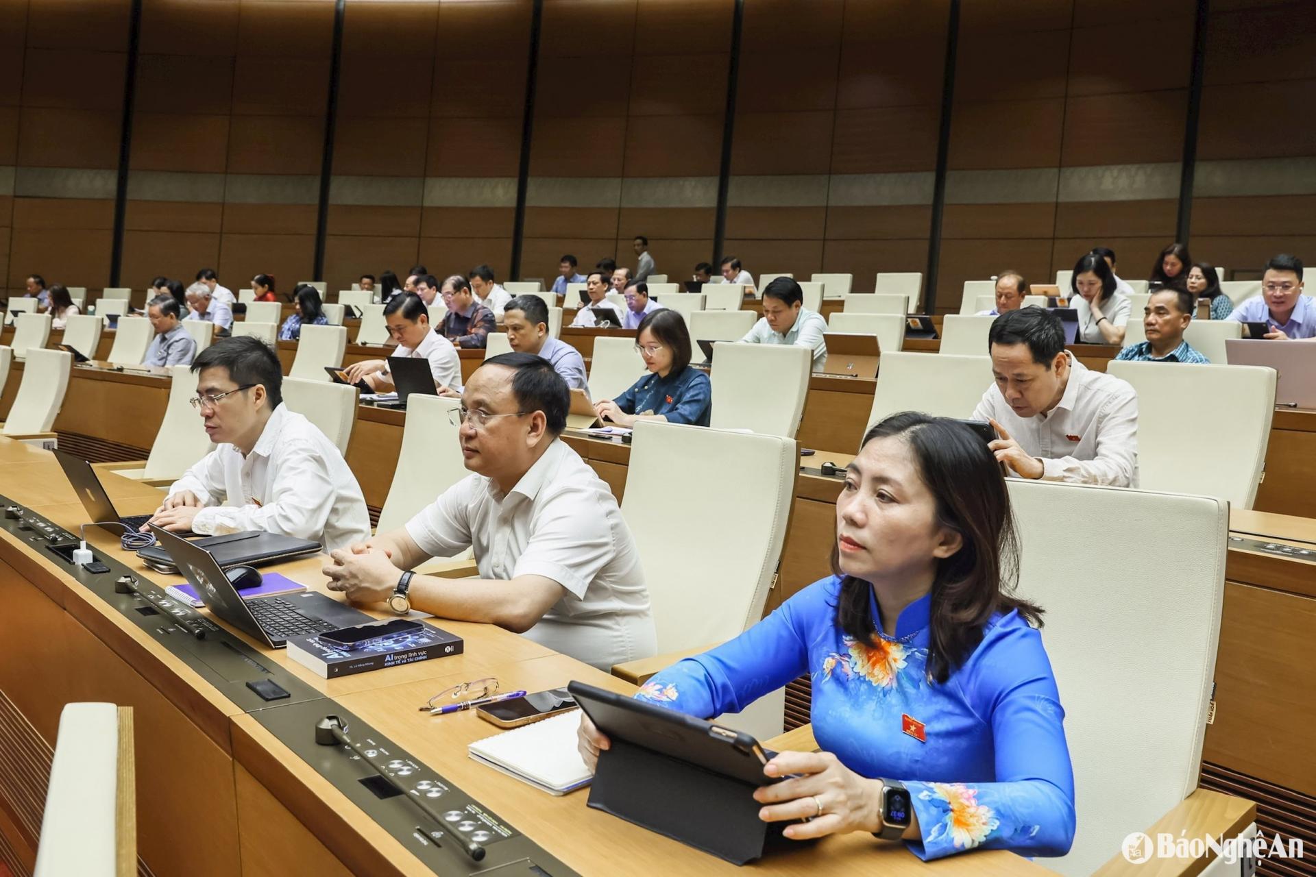 | Các vị ĐBQH đoàn Nghệ An tại phiên làm việc sáng 13/6 ở Hội trường Diên Hồng, Nhà Quốc hội. |