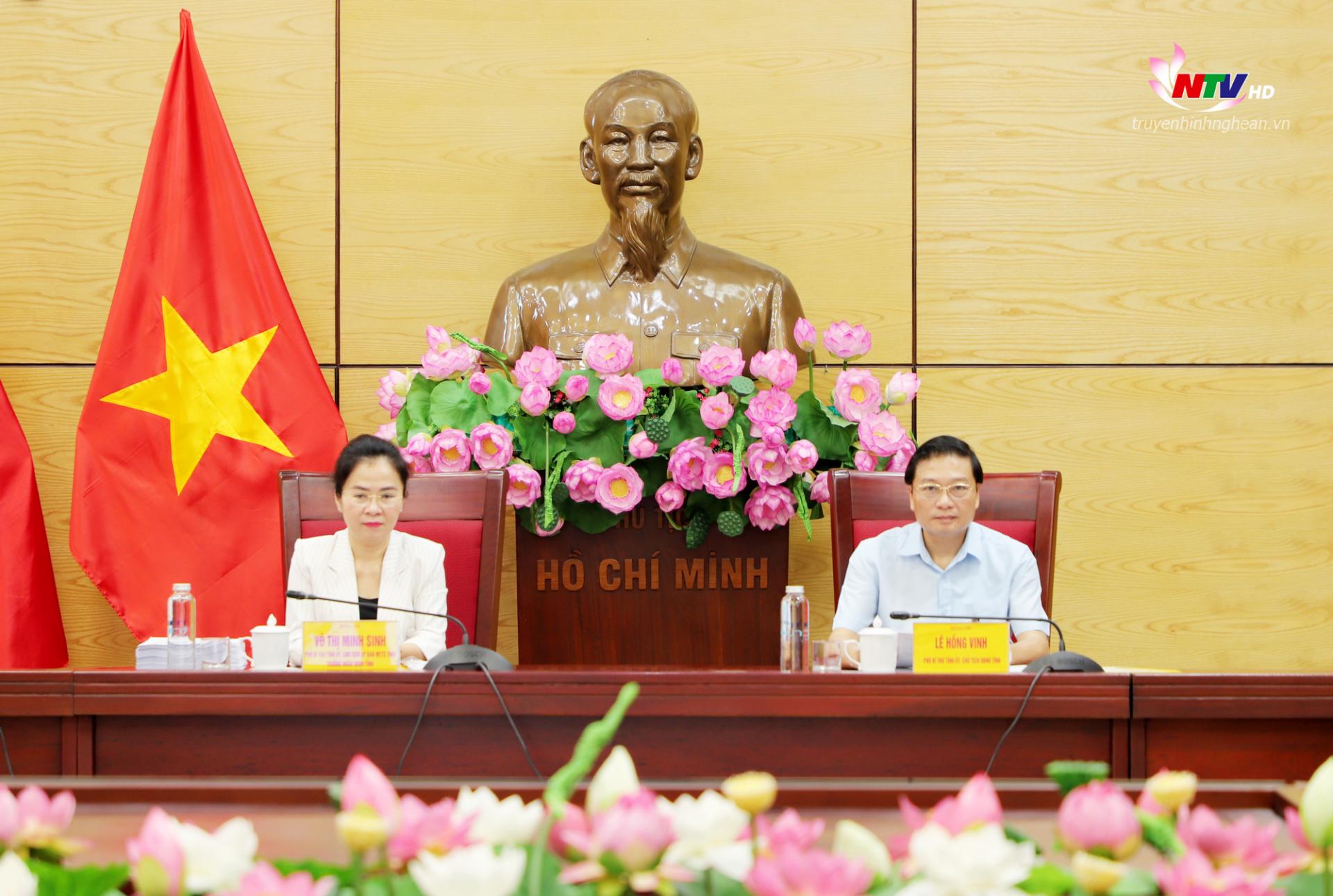 | Các đồng chí: Lê Hồng Vinh - Phó Bí thư Tỉnh ủy, Chủ tịch UBND tỉnh; Võ Thị Minh Sinh - Phó Bí thư Tỉnh ủy, Chủ tịch Ủy ban MTTQ tỉnh, Trưởng đoàn ĐBQH tỉnh dự và chủ trì hội nghị tại điểm cầu Nghệ An. |