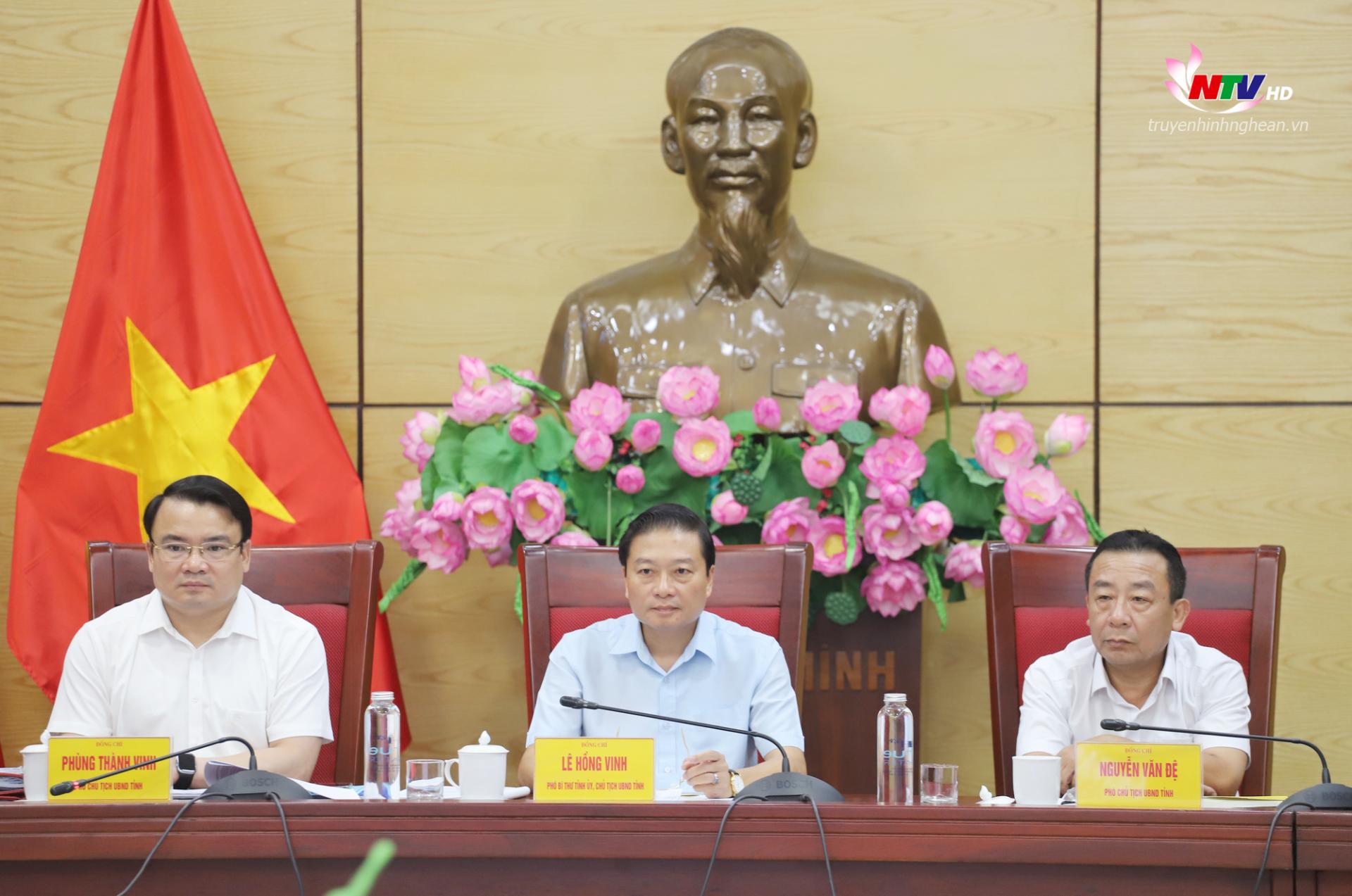 | Các đồng chí: Lê Hồng Vinh - Phó Bí thư Tỉnh uỷ, Chủ tịch UBND tỉnh; Nguyễn Văn Đệ - Phó Chủ tịch UBND tỉnh; Phùng Thành Vinh - Phó Chủ tịch UBND tỉnh chủ trì hội nghị tại điểm cầu tỉnh Nghệ An. |