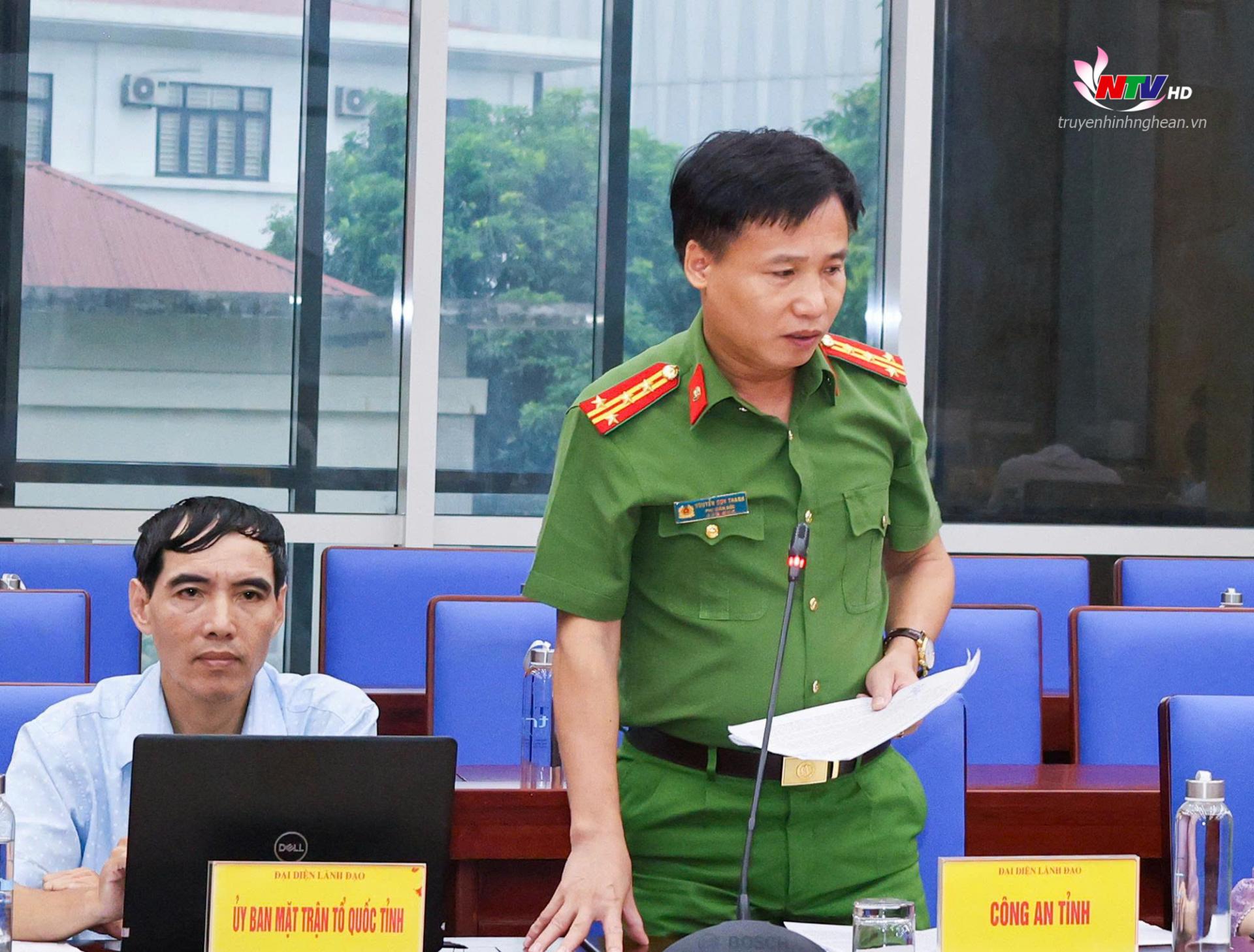 | Đại tá Nguyễn Duy Thanh - Phó Giám đốc Công an tỉnh Nghệ An báo cáo công tác phòng, chống tội phạm và vi phạm pháp luật. |