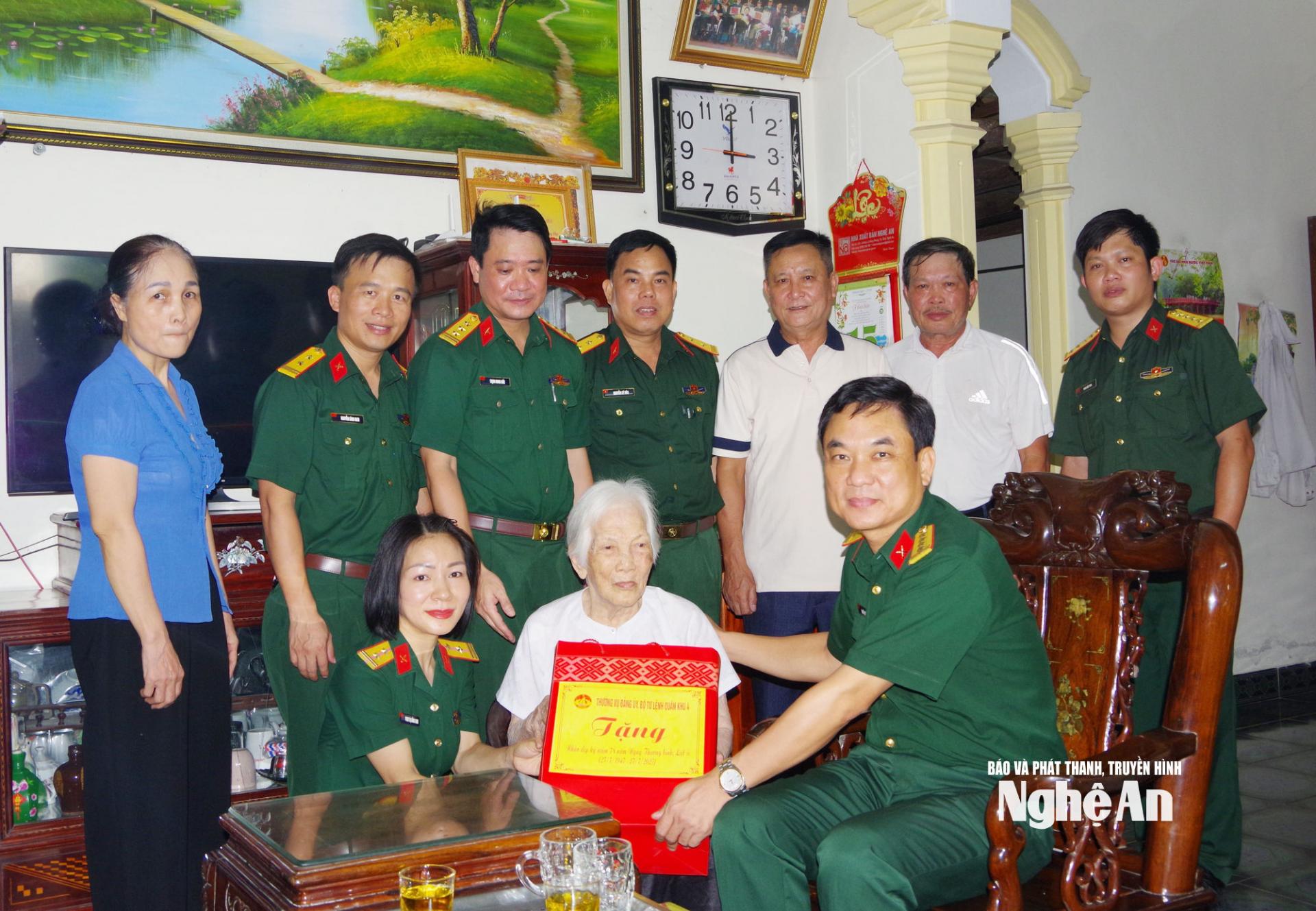 | Đại tá Nguyễn Văn An – Phó Bí thư Đảng ủy, Chính ủy Bộ CHQS tỉnh Nghệ An thăm hỏi, động viên, tặng quà Bà mẹ Việt Nam anh hùng Lê Thị Lục, ở phường Thành Vinh, tỉnh Nghệ An. |