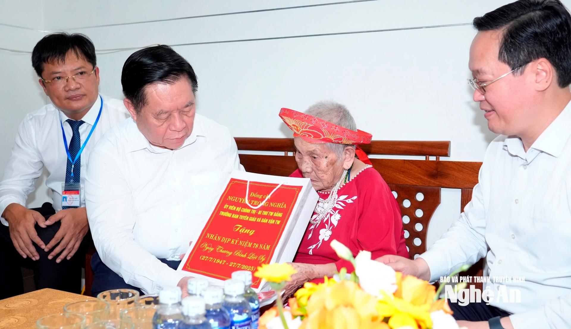 Cùng ngày, đoàn công tác đã đến dâng hương viếng liệt sĩ Nguyễn Bá Tuấn, nguyên Phó Tư lệnh Quân khu 4 và thăm hỏi, động viên, tặng quà Bà mẹ Việt Nam Anh hùng Lê Thị Lục ở phường Thành Vinh, tỉnh Nghệ An.