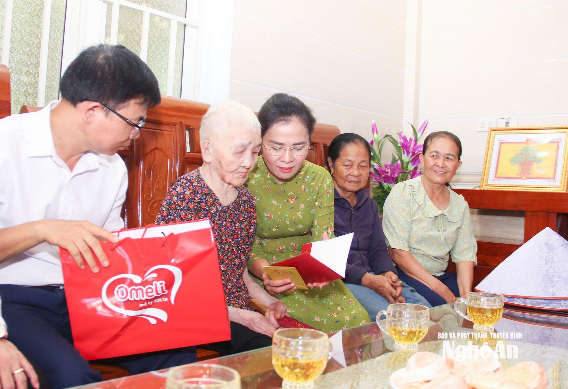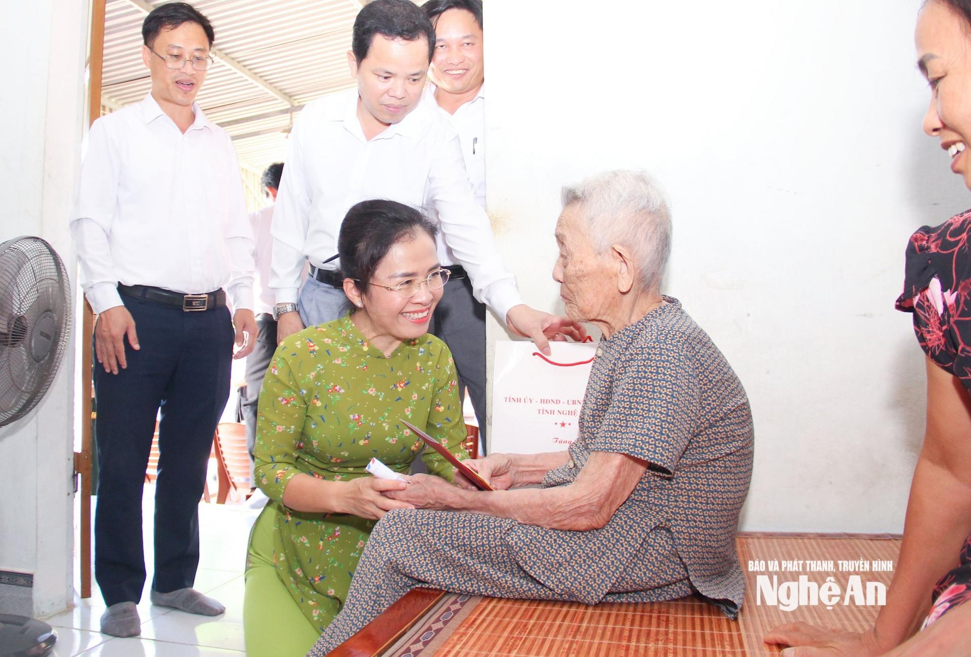 | Đồng chí Võ Thị Minh Sinh - Phó Bí thư Tỉnh ủy, Chủ tịch Ủy ban Mặt trận Tổ quốc Việt Nam tỉnh, Trưởng Đoàn Đại biểu Quốc hội tỉnh thăm hỏi, động viên, tặng quà Mẹ Việt Nam Anh hùng Nguyễn Thị Duân 102 tuổi, xóm 6, xã Phúc Lộc (xã Nghi Mỹ cũ). Ảnh: Mai Hoa |
