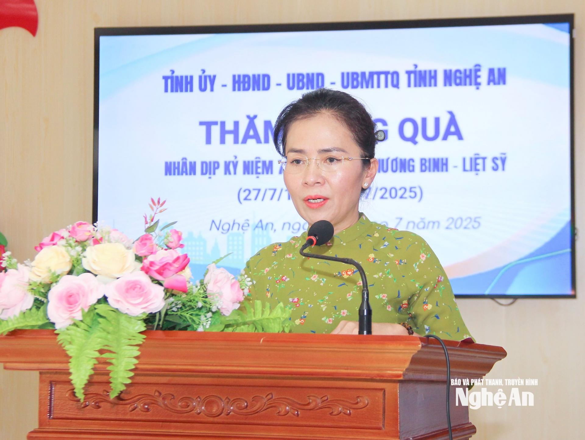 Thăm hỏi, động viên, chúc sức khoẻ đến các thương, bệnh binh và những người chịu ảnh hưởng bởi chiến tranh, đồng chí Võ Thị Minh Sinh – Phó Bí thư Tỉnh uỷ, Chủ tịch Uỷ ban MTTQ Việt Nam tỉnh, Trưởng Đoàn Đại biểu Quốc hội tỉnh bày tỏ lòng biết ơn và tri ân sâu sắc những cống hiến, hy sinh cả tuổi thanh xuân của các bác cho Tổ quốc.