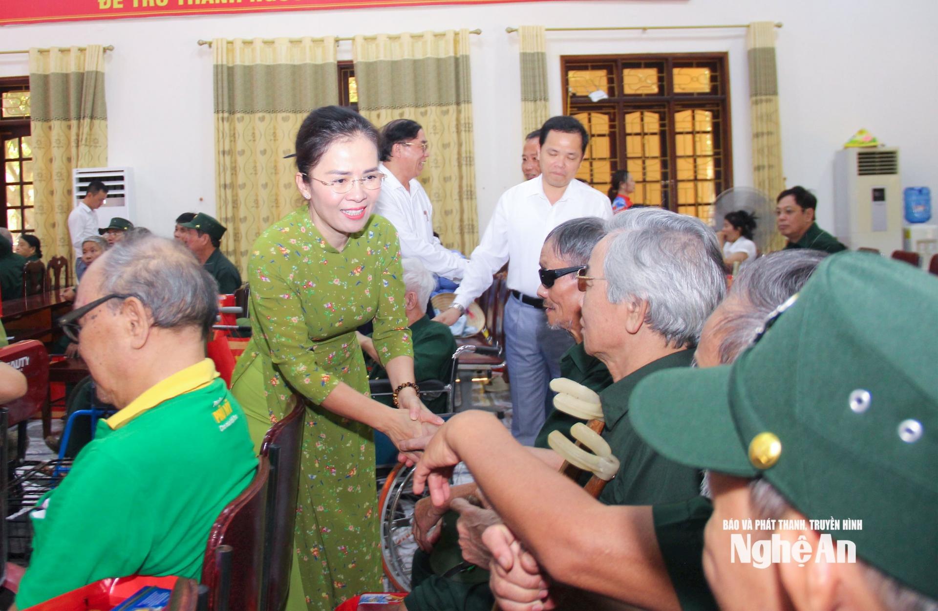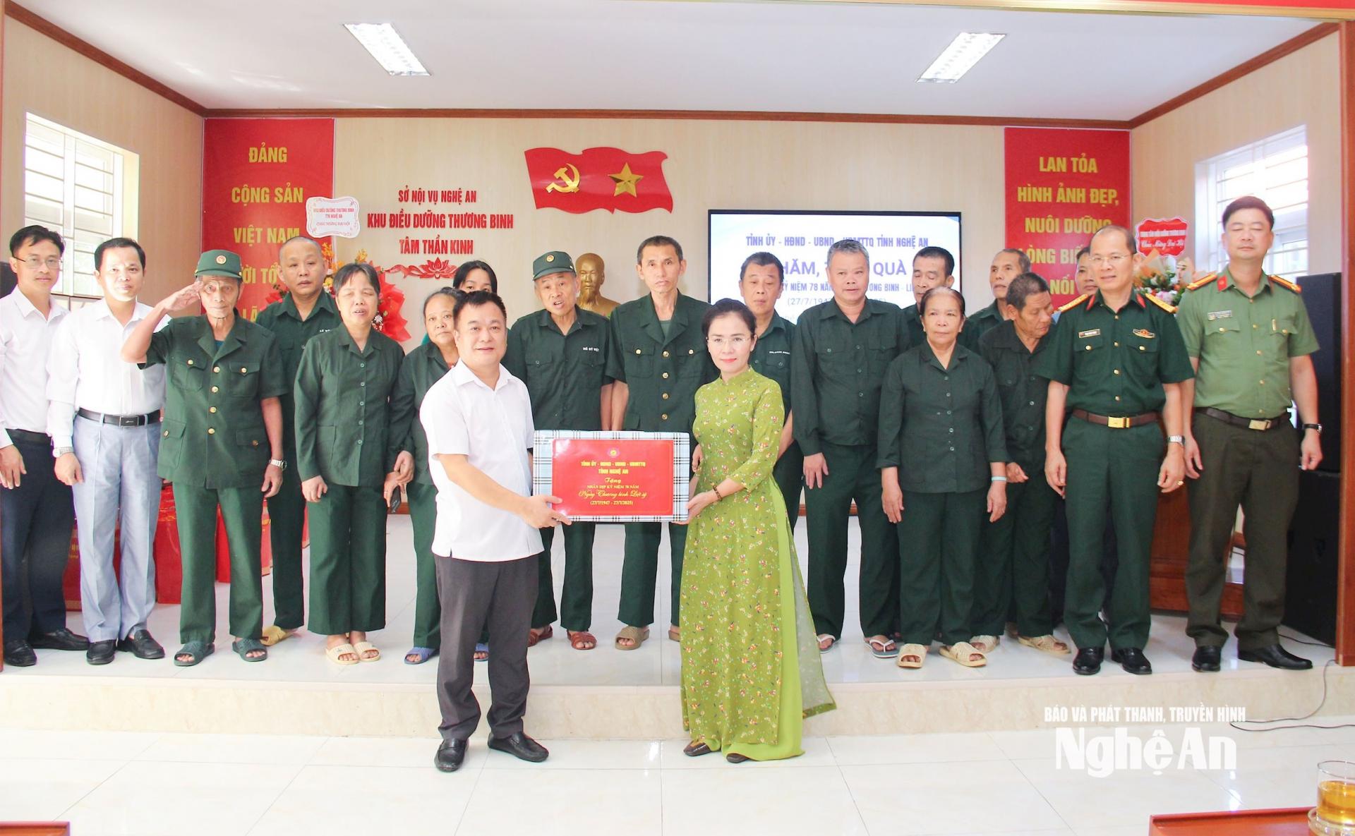 Đoàn công tác của tỉnh cũng đến thăm, tặng quà Trung tâm Điều dưỡng thương binh Nghệ An và Khu Điều dưỡng thương binh tâm thần kinh Nghệ An. Hiện tại, Trung tâm Điều dưỡng thương binh Nghệ An đang quản lý, chăm sóc, nuôi dưỡng, điều dưỡng 55 thương, bệnh binh nặng đã từng tham gia chiến đấu và phục vụ chiến đấu trong các cuộc kháng chiến chống thực dân Pháp, chống đế quốc Mỹ, cuộc chiến tranh bảo vệ biên giới Tổ quốc và làm nghĩa vụ quốc tế.