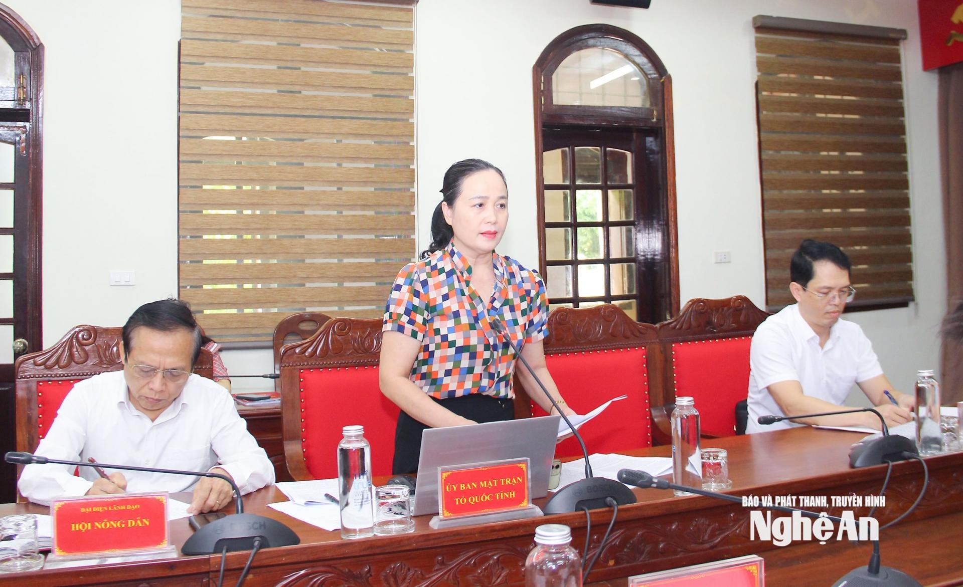 | Phó trưởng Ban Tuyên giáo và Dân vận Tỉnh ủy Nguyễn Thị Thơm báo cáo kết quả thực hiện nhiệm vụ quý II/2025 của Ủy ban Mặt trận Tổ quốc và các tổ chức chính trị - xã hội cấp tỉnh. |
