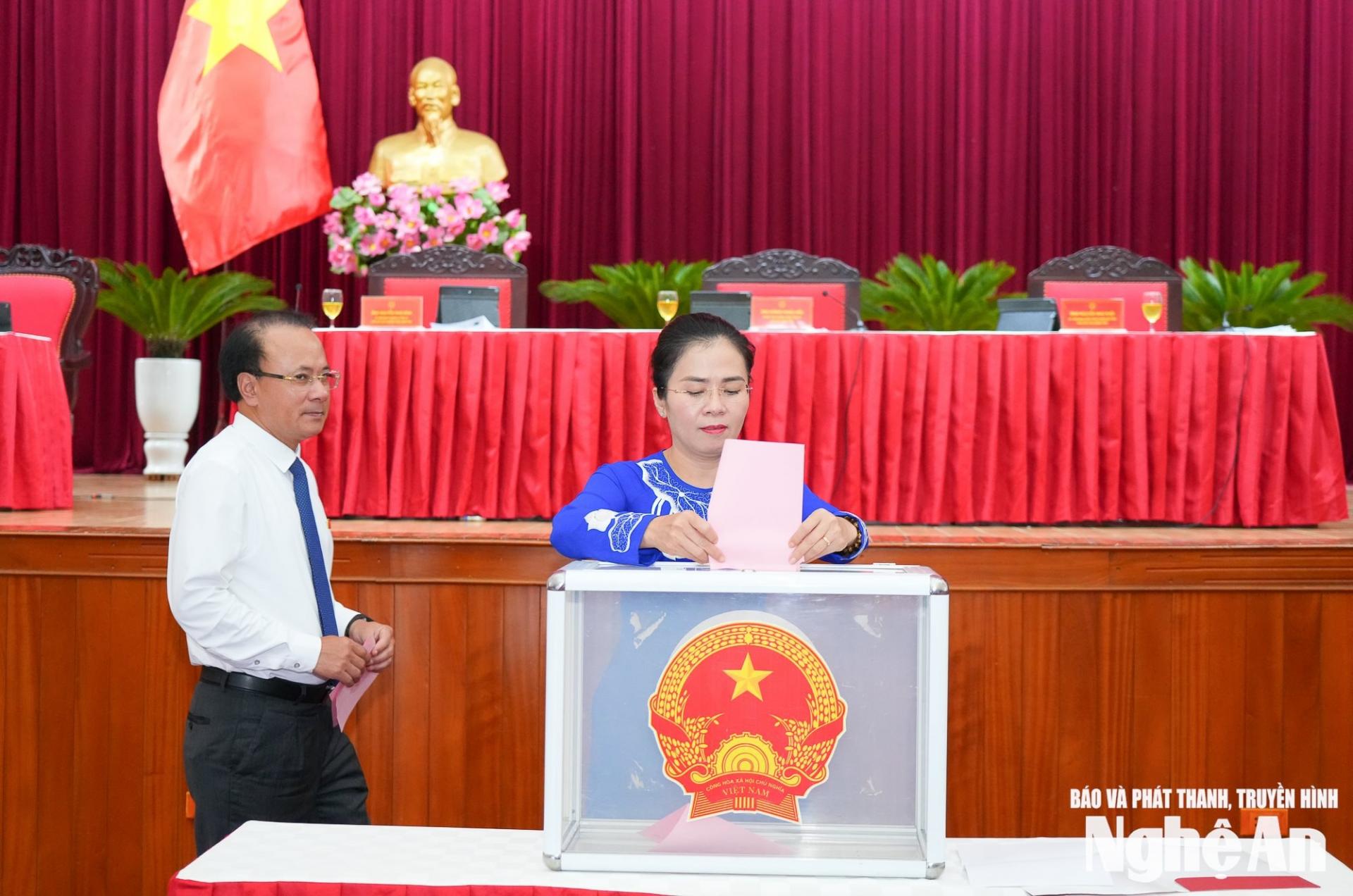 | Đồng chí Võ Thị Minh Sinh - Phó Bí thư Tỉnh ủy, Chủ tịch Ủy ban MTTQ Việt Nam tỉnh, Trưởng đoàn ĐBQH tỉnh và đồng chí Nguyễn Nam Đình - Ủy viên Ban Thường vụ Tỉnh ủy, Phó Chủ tịch Thường trực HĐND tỉnh bỏ phiếu bầu Ủy viên UBND tỉnh nhiệm kỳ 2021-2026. |
