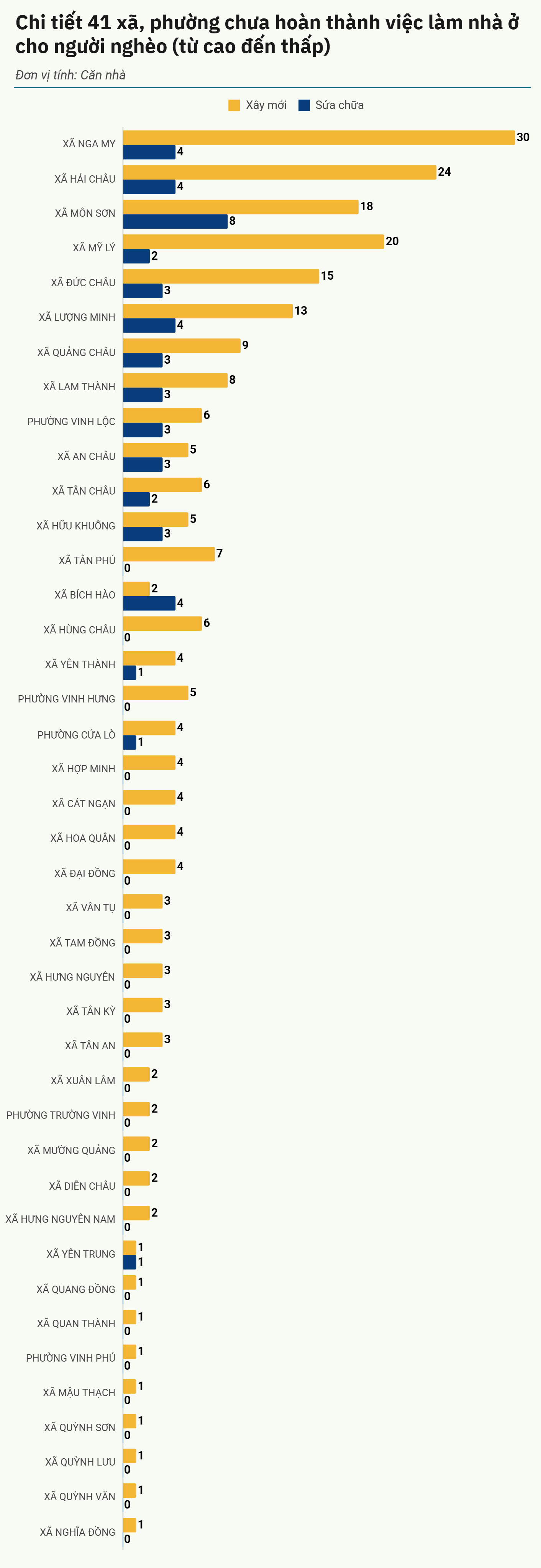 Chi tiết 41 xã, phường chưa hoàn thành việc làm nhà ở cho người nghèo (từ cao đến thấp): Xã Nga My 34 căn (xây mới 30 căn, sửa chữa 4 căn); xã Hải Châu 28 căn (xây mới 24 căn, sửa chữa 4 căn); xã Môn Sơn 26 căn (xây mới 18 căn, sửa chữa 8 căn); xã Mỹ Lý 22 căn (xây mới 20 căn, sửa chữa 2 căn).