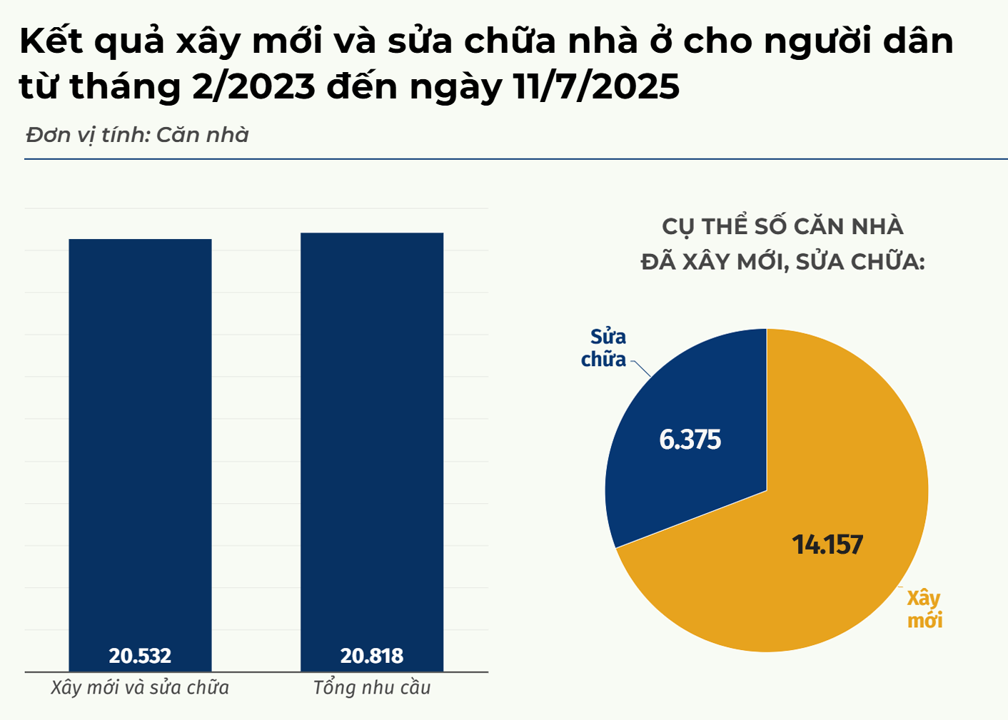 Kết quả lũy kế trong gần 2 năm rưỡi triển khai Chương trình vận động, hỗ trợ người nghèo và hộ có khó khăn về nhà ở của tỉnh, từ tháng 2/2023, đến ngày 11/7/2025, toàn tỉnh đã xây mới và sửa chữa 20.532 căn nhà cho người dân (xây mới 14.157 căn, sửa chữa 6.375 căn)/tổng nhu cầu của cả giai đoạn được các địa phương phê duyệt là 20.818 căn, đạt 98,63%.