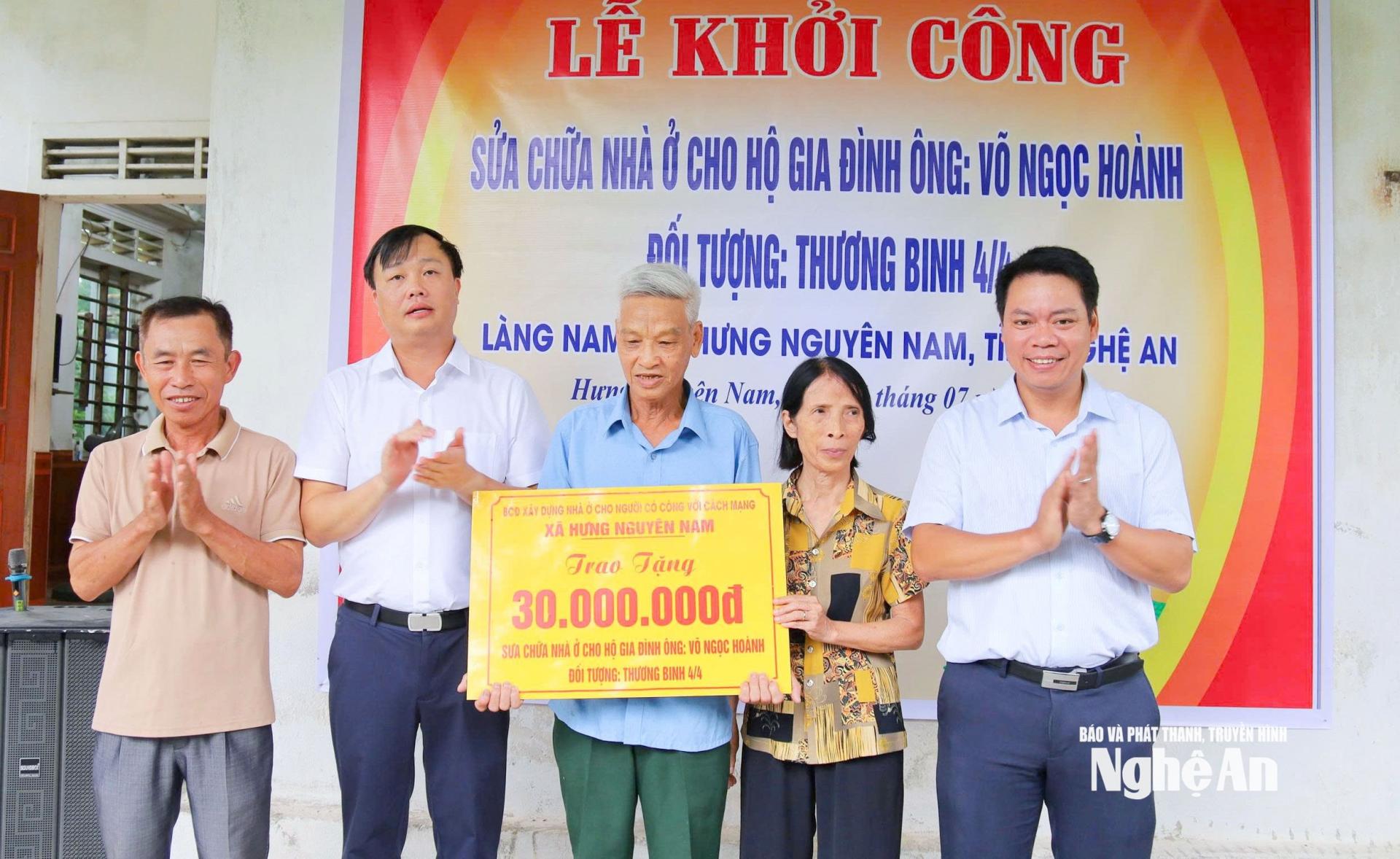 | Lãnh đạo xã Hưng Nguyên Nam trao hỗ trợ sửa chữa nhà ở cho người dân. |