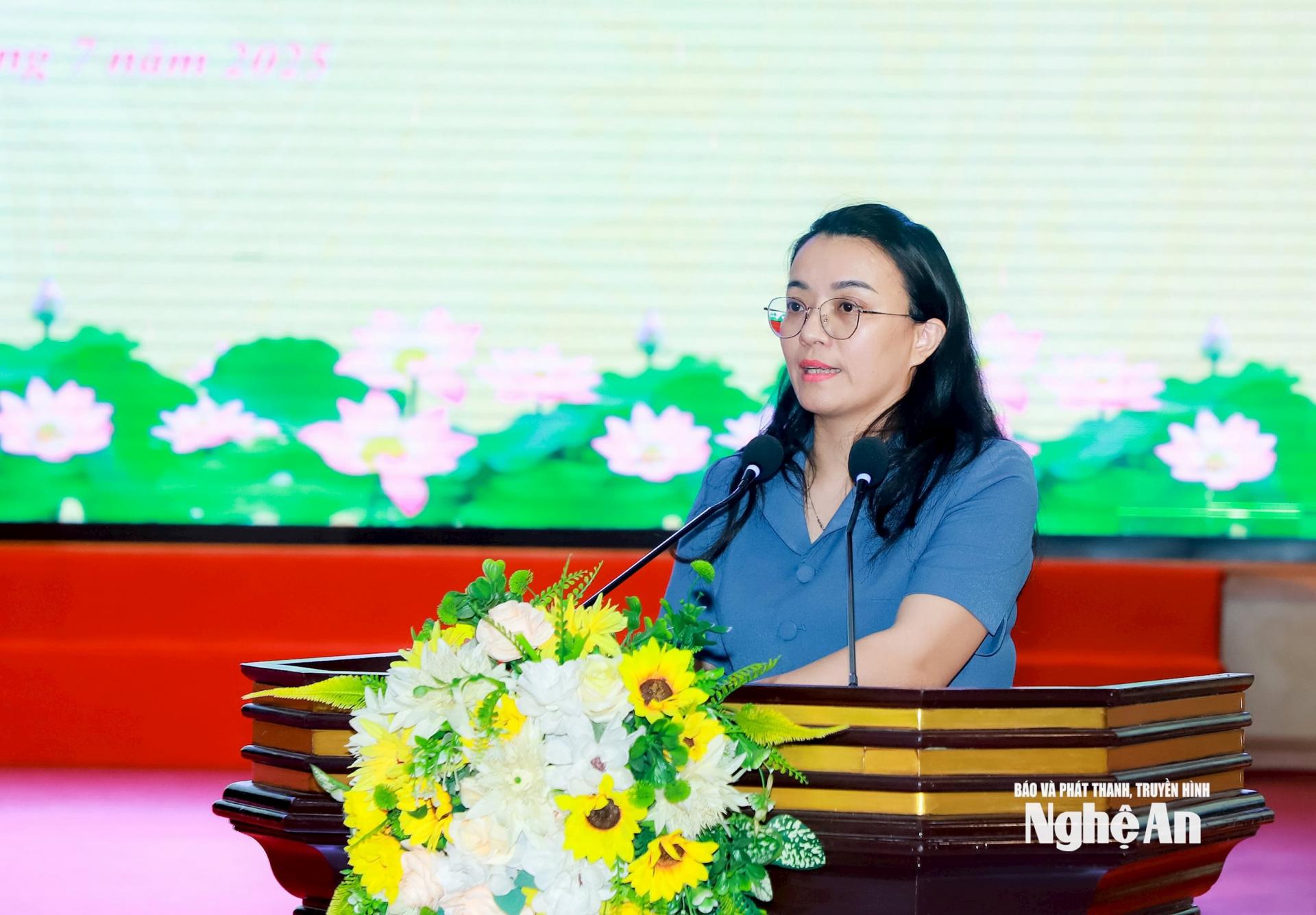 | Giám đốc Sở Tư pháp Nghệ An Hoàng Thị Thu Trang báo cáo về tình hình ban hành văn bản quy phạm pháp luật của HĐND, UBND tỉnh trong 6 tháng đầu năm 2025. Ảnh: Thành Duy |