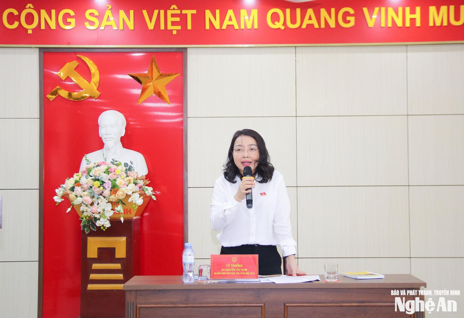 Tham gia phiên thảo luận tại tổ 1 có 16 đại biểu HĐND tỉnh thuộc các Tổ đại biểu số 1, 2 và 4, lãnh đạo một số sở, ngành cấp tỉnh và 17 xã, phường. Cùng dự có các đồng chí: Phan Đức Đồng - Uỷ viên Ban Thường vụ Tỉnh uỷ, Bí thư Đảng uỷ, Chủ tịch HĐND phường Trường Vinh, Bùi Đình Long - Uỷ viên Ban Chấp hành Đảng bộ tỉnh, Phó Chủ tịch UBND tỉnh.