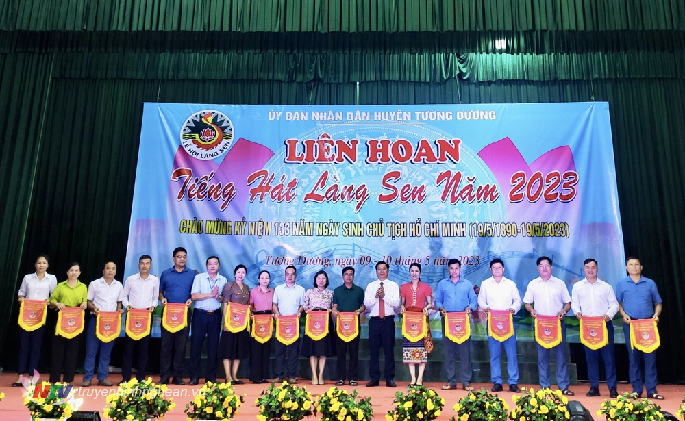 | Trung tướng Nguyễn Ngọc Toàn và Phó Chủ tịch UBND tỉnh Bùi Đình Long tặng hoa và biểu trưng cho đại diện các đoàn nghệ thuật quần chúng |