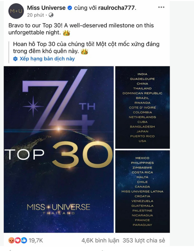 Ngay sau khi công bố kết quả Top 30, hiện bài đăng trên trang Facebook chính thức của Miss Universe đang nhận về "bão" phẫn nộ của đông đảo khán giả trên khắp thế giới. Nhiều bình luận bày tỏ sự tiếc nuối khi đại diện không được gọi tên trong Top 30.