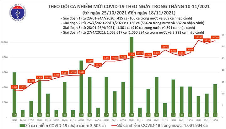 Tính từ 16h ngày 18/11 đến 16h ngày 19/11, trên Hệ thống Quốc gia quản lý ca bệnh COVID-19 ghi nhận 9.625 ca nhiễm mới, trong đó 8 ca nhập cảnh và 9.617 ca ghi nhận trong nước (giảm 592 ca so với ngày trước đó) tại 57 tỉnh, thành phố (có 4.995 ca trong cộng đồng).