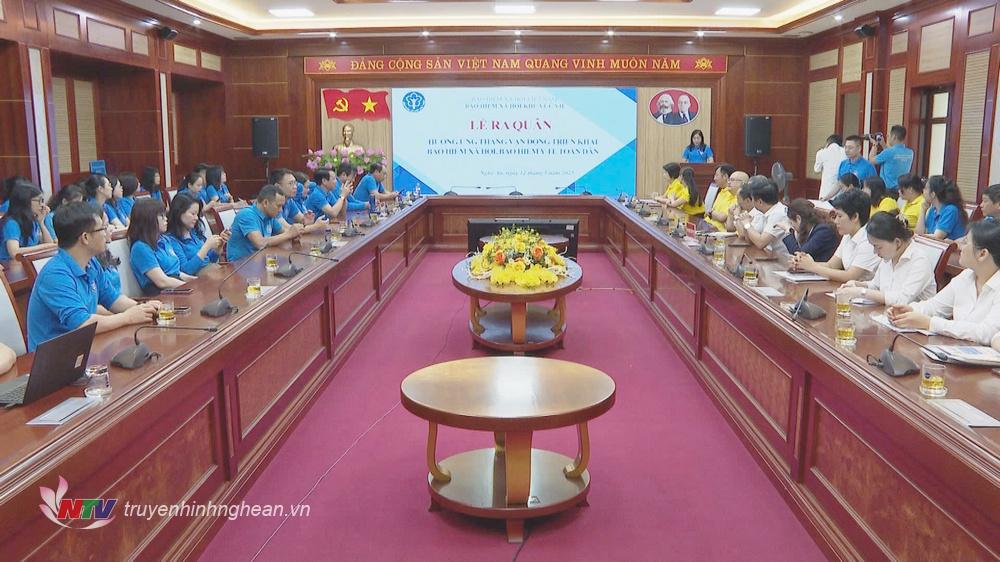 | Lãnh đạo Bảo hiểm xã hội khu vực VII, Bưu điện tỉnh Nghệ An và các tổ chức dịch vụ nhận ủy quyền thu bảo hiểm xã hội, bảo hiểm y tế thực hiện nghi thức ra quân hưởng ứng Tháng vận động triển khai bảo hiểm xã hội, bảo hiểm y tế. |